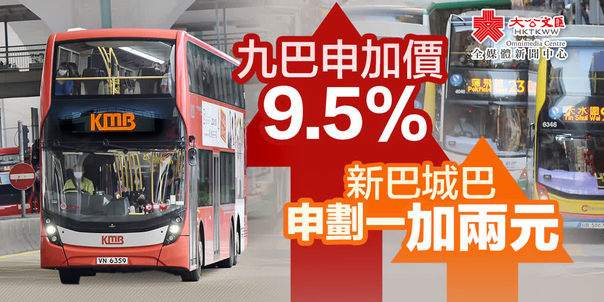 大公文匯全媒體報道,運輸及物流局今日(14日)向立法會提交文件,交代各巴士公司申請加價情況。文件顯示,九巴申請加9.5%、城巴及新巴申請所有路線劃一加兩元,城巴機場線申請加五成。