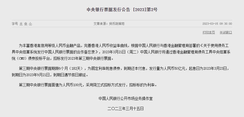 據央視新聞報道,中國人民銀行今日(15日)發布公告,為豐富香港高信用等級人民幣金融產品,完善香港人民幣收益率曲線,根據中國人民銀行與香港金融管理局簽署的《關於使用債務工具中央結算系統發行中國人民銀行票據的合作備忘錄》,2023年3月21日(周二)中國人民銀行將通過香港金融管理局債務工具中央結算系統(CMU)債券投標平台,招標發行2023年第三期中央銀行票據。