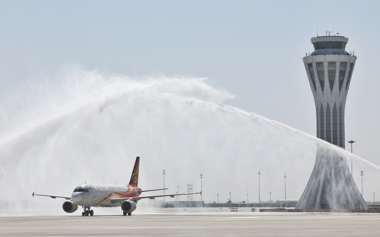 為迎接香港航空首班航班降落,北京大興國際機場進行了水門禮歡迎儀式,祝賀公司拓展航線網絡。
