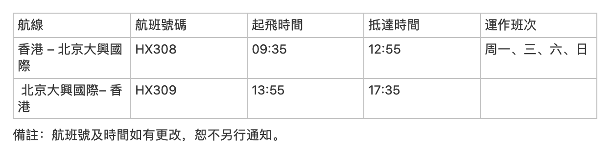 香港航空每周四班來往香港和北京大興機場的航班詳情*如下(所有時間均為當地時間):