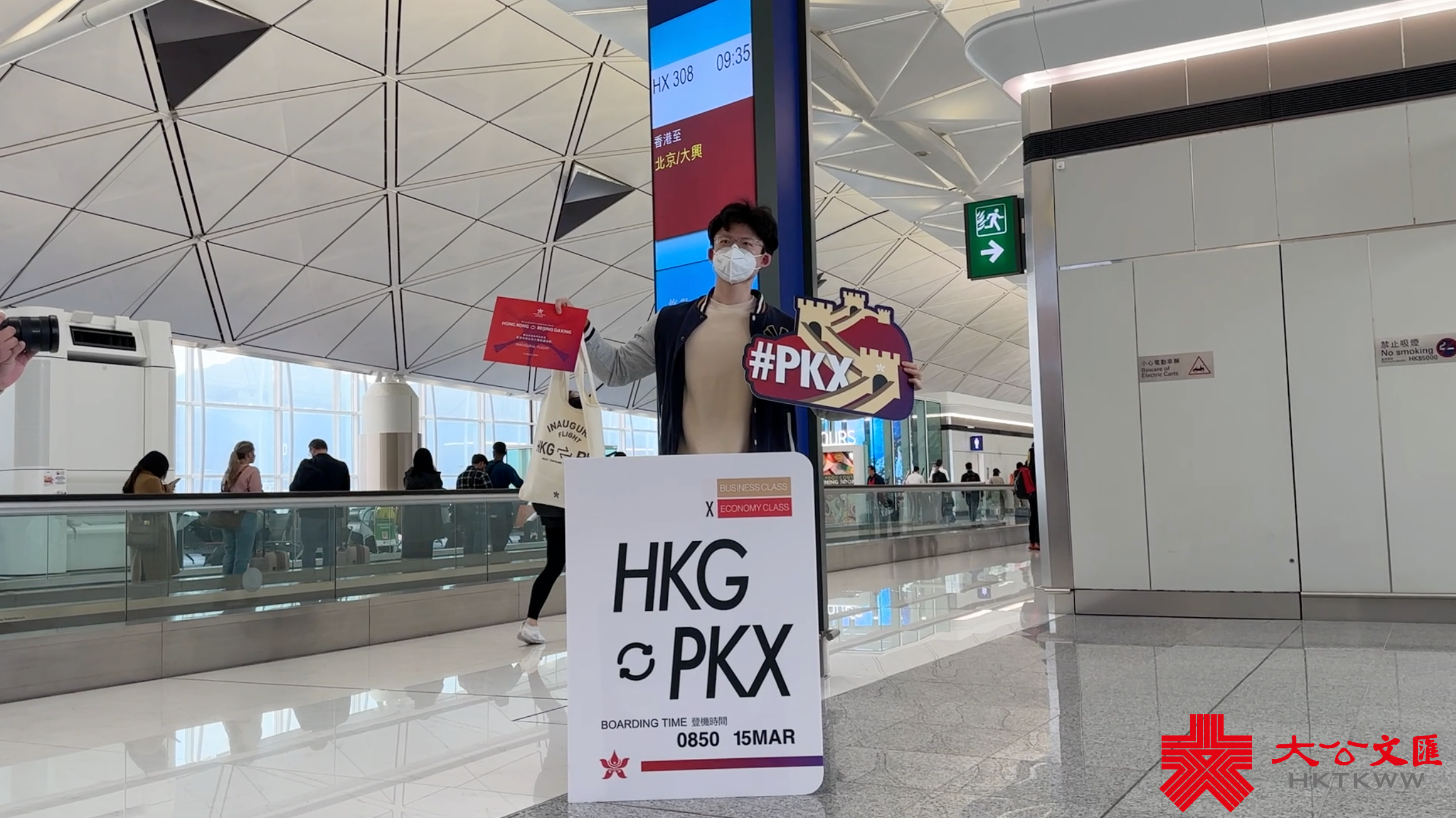 香港航空工作人員還在登機口與乘客互動及派發首航專屬紀念品,分享喜悅。首航編號HX308航班隨後於上午9時35分從香港出發,於下午12時55分到達北京大興國際機場。