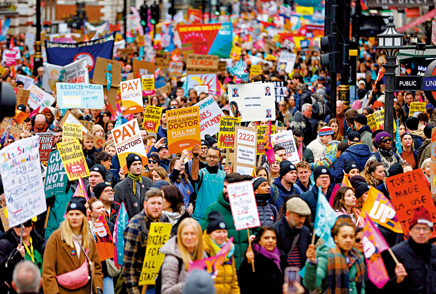 在新財政預算公布當天,英國公務員、教師、BBC記者、地鐵司機和醫生湧上街頭,要求提高薪資,共計約50萬人。分析指,工人們的行動沖淡了政府預算案的「宣傳噱頭」。示威者們除了抗議工資追不上通脹外,還抱怨工作條件差及養老金低。
