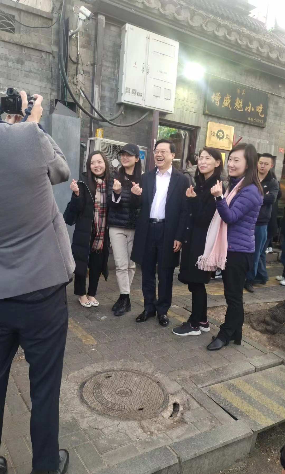 七點半左右特首一行離開時,上門吃早點的北京市民紛紛圍住特首紛紛要求合影,特首也欣然應允,大家一起在店門前為北京小吃點讚。