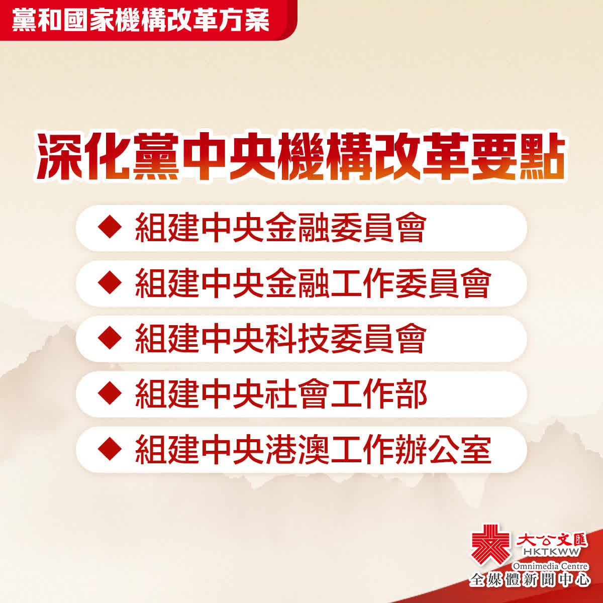 (五)組建中央港澳工作辦公室。承擔在貫徹「一國兩制」方針、落實中央全面管治權、依法治港治澳、維護國家安全、保障民生福祉、支持港澳融入國家發展大局等方面的調查研究、統籌協調、督促落實職責,在國務院港澳事務辦公室基礎上組建,作為黨中央辦事機構,保留國務院港澳事務辦公室牌子。