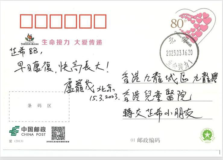 大公文匯全媒體報道,患急性心衰竭、未足周歲的女嬰芷希,去年底成功接受內地跨境捐贈心臟進行移植。正在北京訪問的醫務衞生局(醫衞局)局長盧寵茂教授昨日(15日)在中國器官移植發展基金會內的郵政局寫為芷希寫下祝福明信片,今日(16日)已寄出。