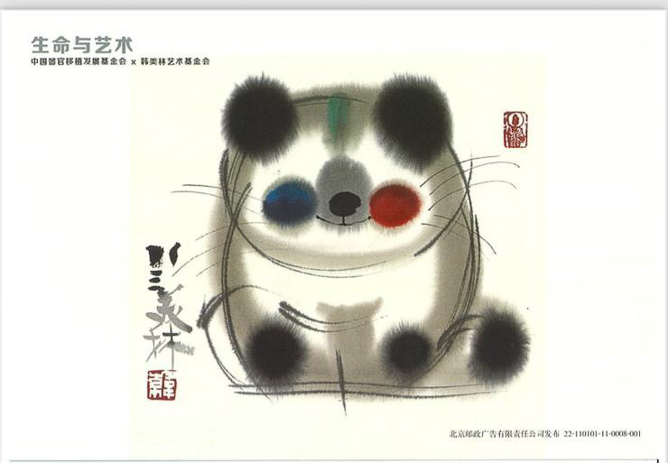 明信片正面是韓美林所畫的熊貓圖案,背面則寫有「芷希BB,早日康復,快高長大!」的祝福。