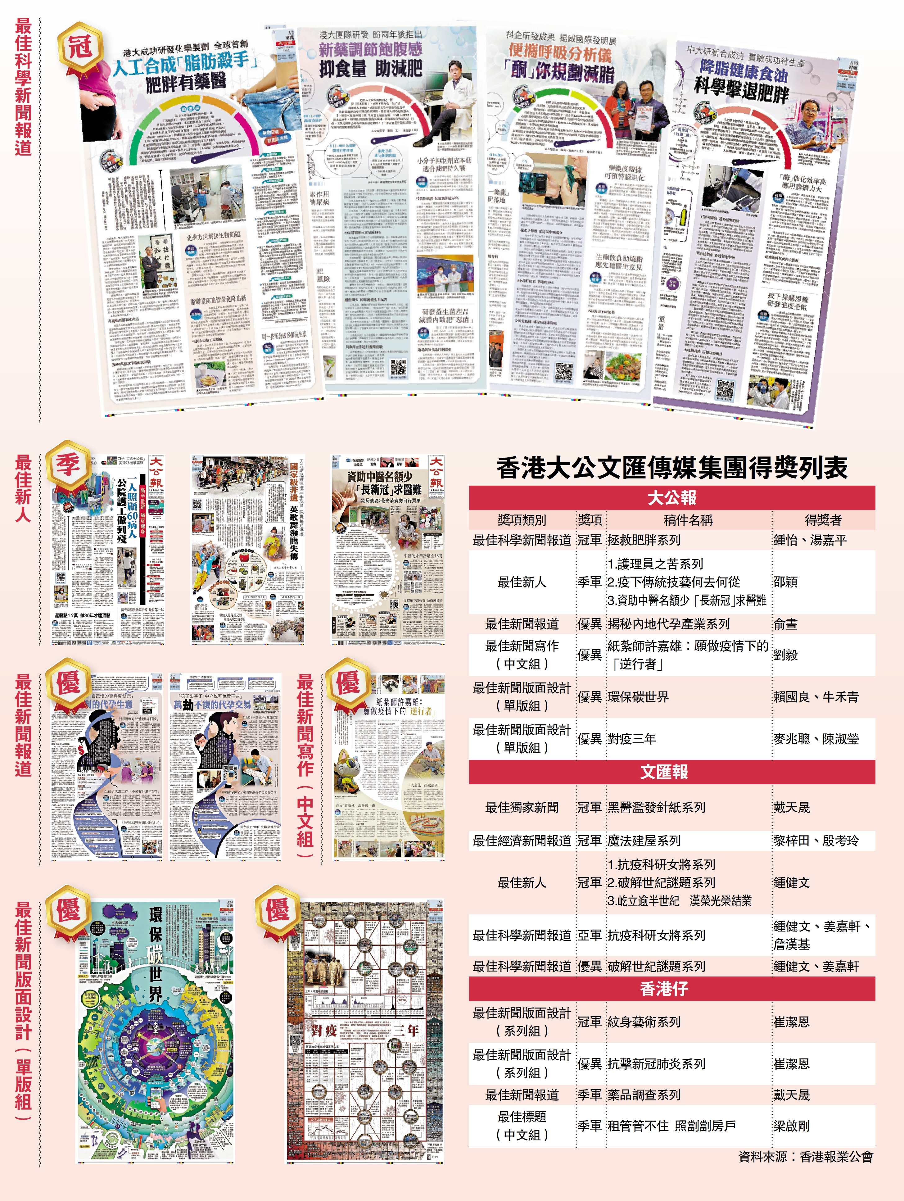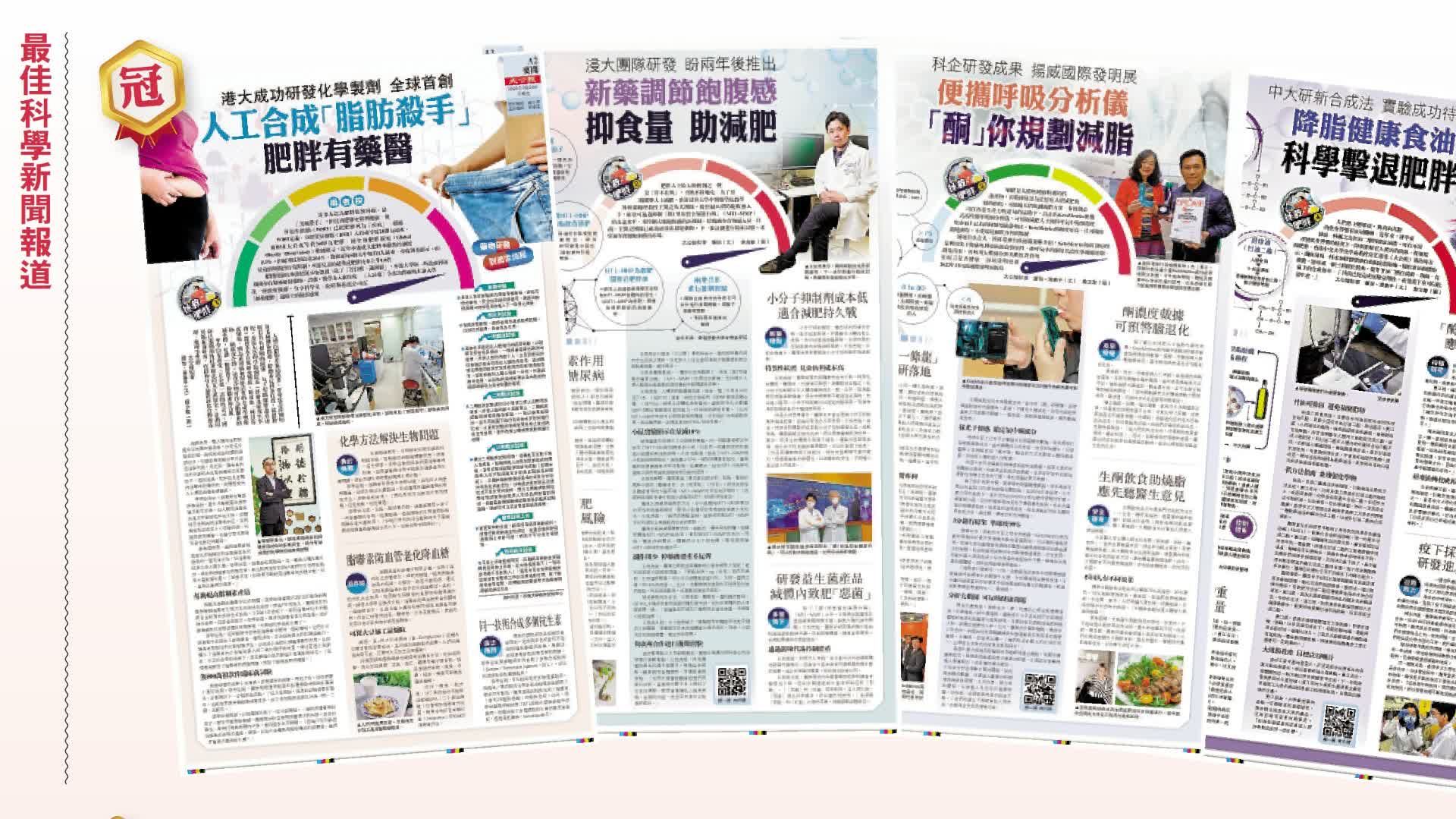 香港報界盛事「2022年香港最佳新聞獎」評審結果揭曉,大文集團在全部17組獎項中的四個組別奪得15個獎項,而《大公報》共獲得6個獎項。《大公報》憑「拯救肥胖」系列榮獲「最佳科學新聞報道」冠軍。該系列報道肥胖、超重在香港已成為不容忽視的問題,除了個人要「管住嘴」控制體重,科學界也已經「邁開腿」,研究如何解決肥胖問題。記者訪問了大學的科研人員、科創公司等,詳盡剖析科學界在研發藥物、設備等方面的工作,藉肥胖問題的科學突破,體現了香港的創科力量,報道引起社會廣泛關注。
