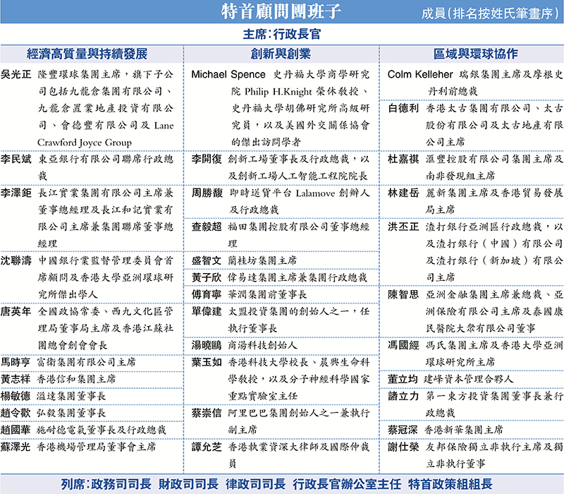 香港文匯報報道,香港特區政府昨日公布成立特首顧問團,由行政長官擔任主席並委任34名成員。顧問團是一個高層次的諮詢組織,就香港的策略性發展為行政長官提供意見,以把握國家和全球的發展機遇,34名成員來自工商科技界以及專家、學者等,按三大方向分組,即「經濟高質量與持續發展」、「創新與創業」及「區域與環球協作」(見表),以更聚焦和深入的交流。