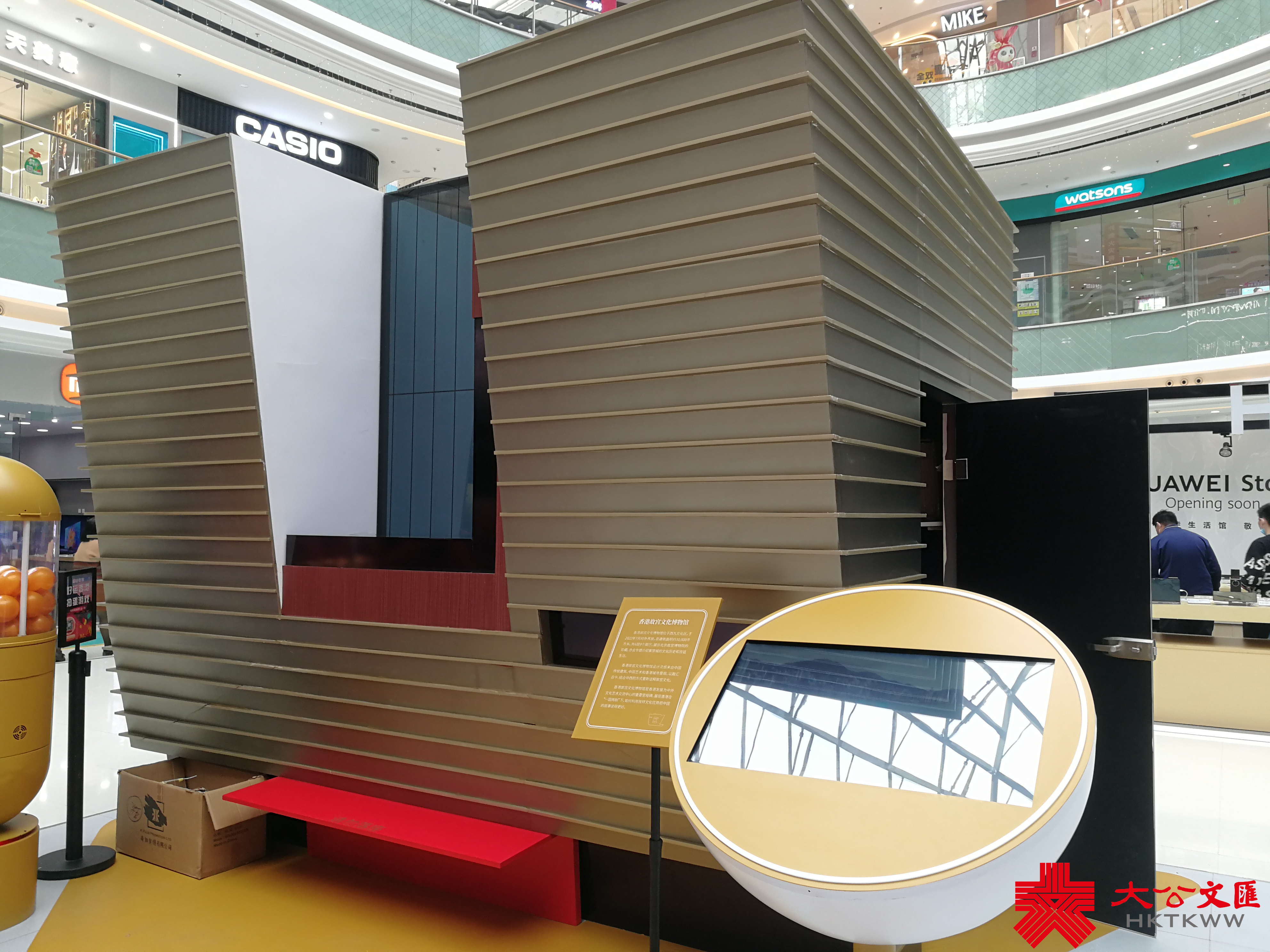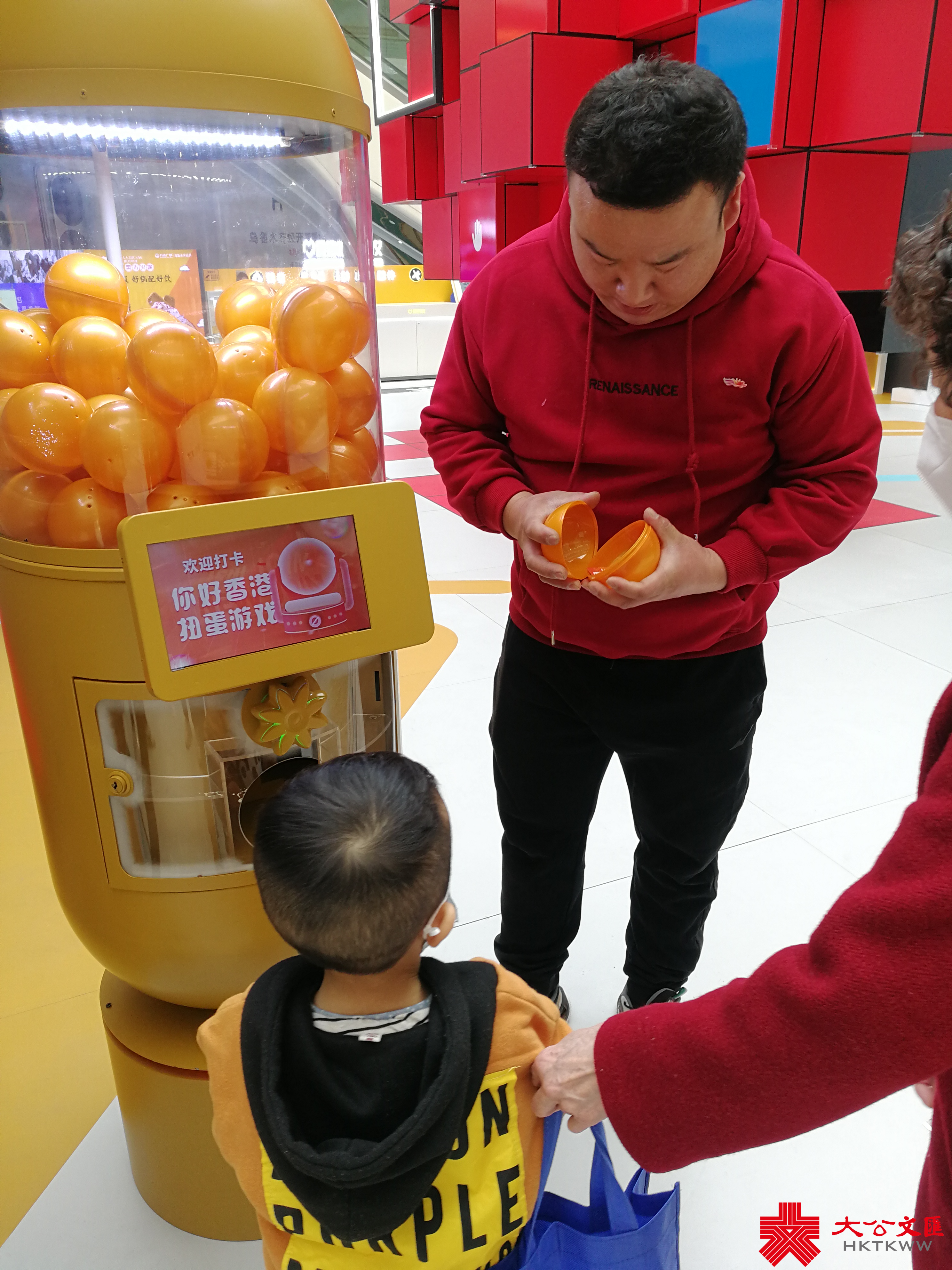 在微小版香港故宮文化博物館打卡區旁的「趣味扭蛋」機旁,4歲的王鍾小朋友在奶奶的幫助下扭出一個橙色的「蛋」,打開是一個香港天星小輪模型的手機環。王鍾興奮地跳了起來……