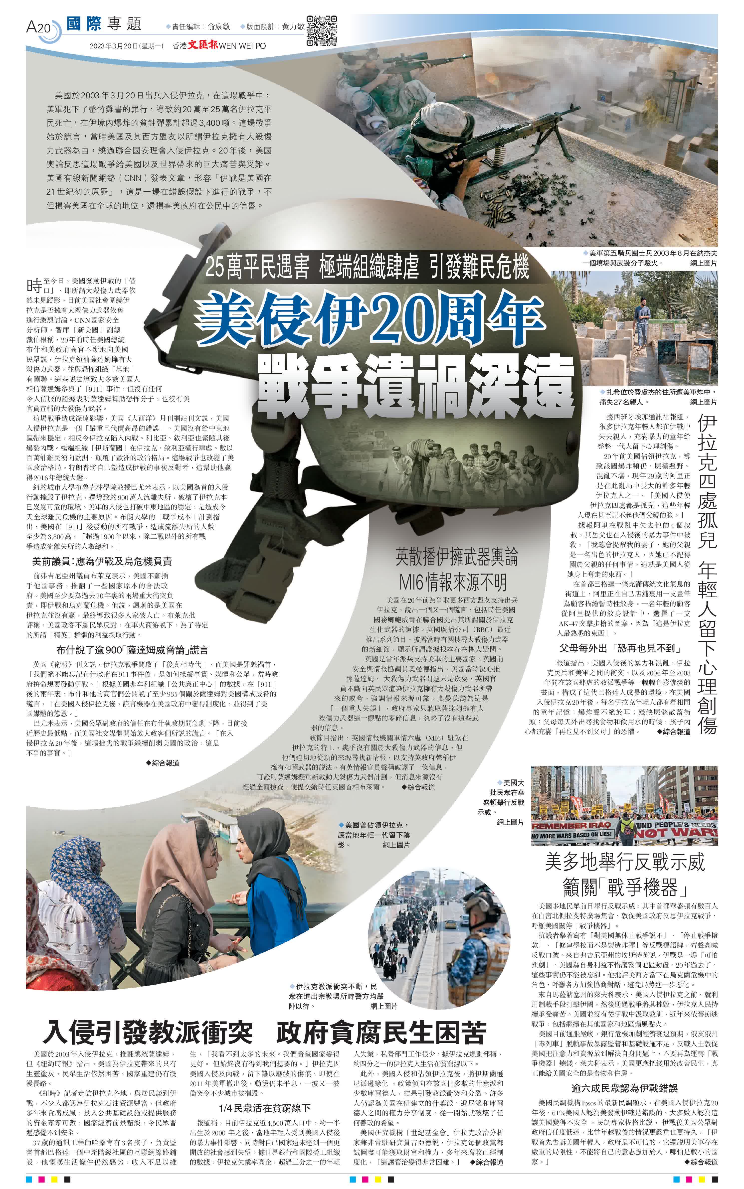 大公報綜合報道,美國於2003年3月20日出兵入侵伊拉克,在這場戰爭中,美軍犯下了罄竹難書的罪行,導致約20萬至25萬名伊拉克平民死亡,在伊境內爆炸的貧鈾彈累計超過3,400噸。這場戰爭始於謊言,當時美國及其西方盟友以所謂伊拉克擁有大殺傷力武器為由,繞過聯合國安理會入侵伊拉克。20年後,美國輿論反思這場戰爭給美國以及世界帶來的巨大痛苦與災難。美國有線新聞網絡(CNN)發表文章,形容「伊戰是美國在21世紀初的原罪」,這是一場在錯誤假設下進行的戰爭,不但損害美國在全球的地位,還損害美政府在公民中的信譽。