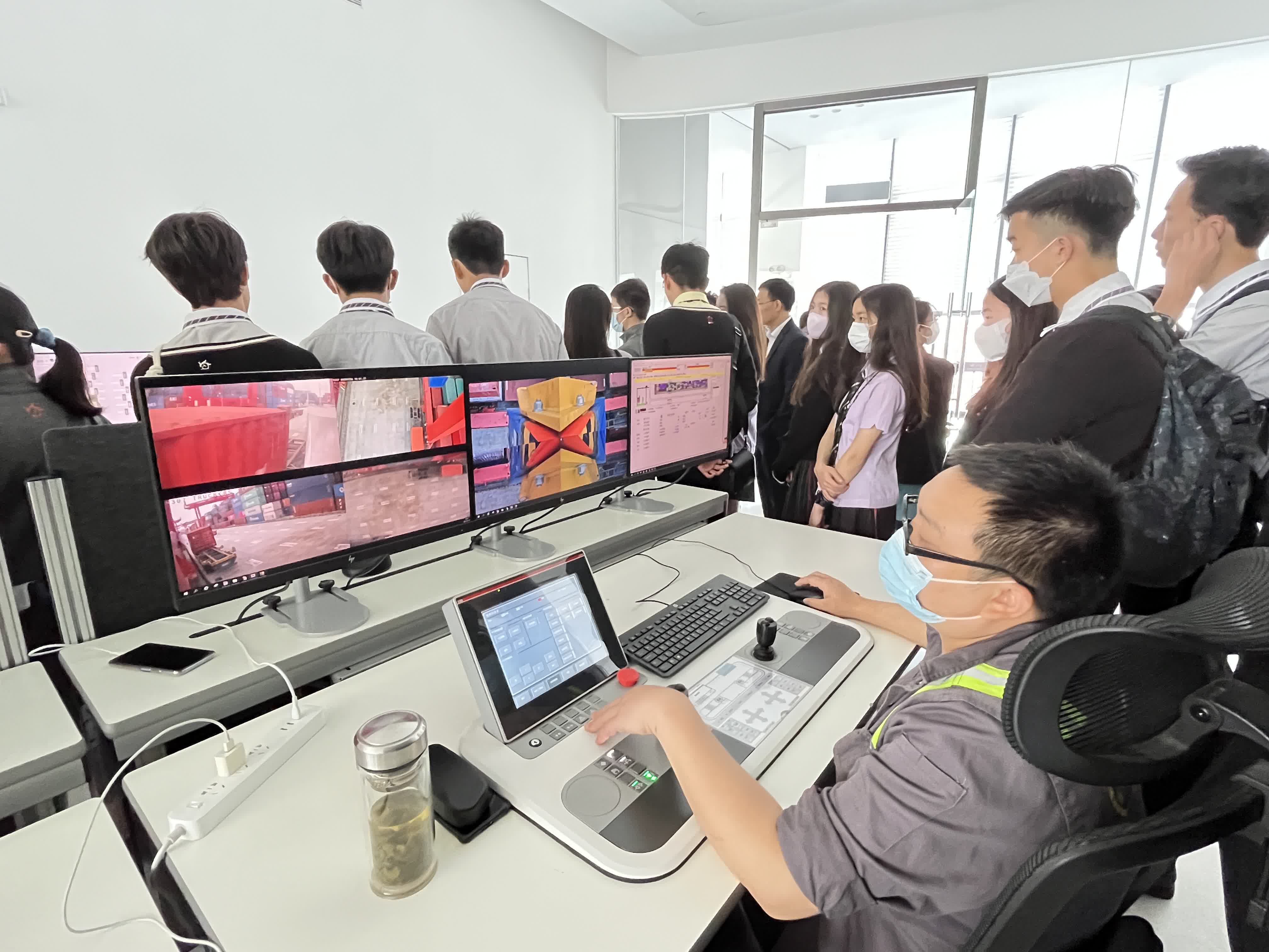 「可能在其他地方還是靠人手,在這裏已經實現自動化操作,多項創新都打破了國外壟斷。」在智能操作中心,學生們深度體驗到自動化操作專業和效率。在自動化軌道吊(RMG)操作區,9個操作台負責26台全自動軌道吊的遠控操作,作業效率可高達28吊/小時,1個司機可控制6台設備。遠控輪胎吊(RTG)操作區更是實現了人機比1比3以上配置,多對多操作,是全球傳統輪胎吊改造起步最早,成本最低、規模最大、操作量最多遠控RTG碼頭。38台自動駕駛車拖車和有人車混行,屬國內首創,1個安全員在後台也能監護5台車自動運行。同學們驚訝於高水平的自動化,好奇「不會出現誤差嗎?出現誤差怎麼辦?」招商局負責人解釋道,配備的安全員負責檢查工作。參觀結束之際,香港培僑書院向招商局贈送了穿校服的紀念品玩偶作為感謝。