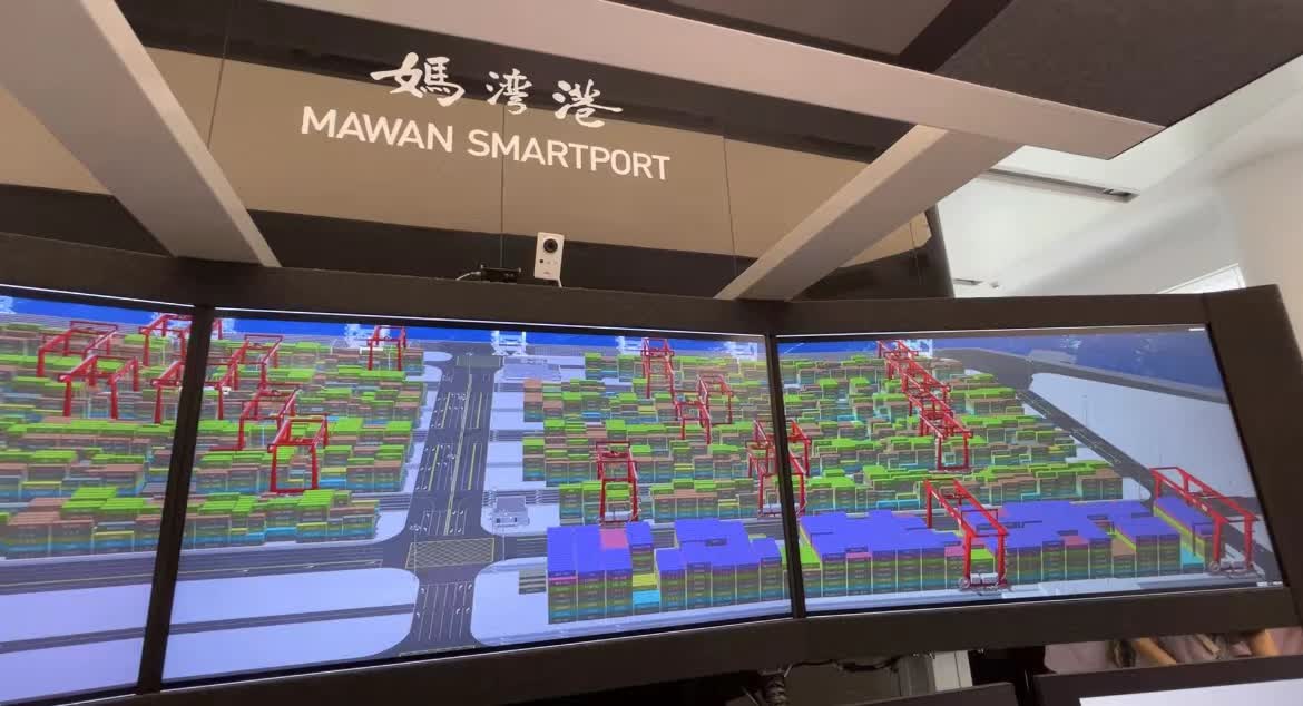 站在觀景台上,同學們可以俯瞰整個智慧化碼頭。「各位所看到的藍色工作區域是由『傳統』輪胎吊升級改造後的『遠控』輪胎吊,共有36台;而紅色工作區域是由傳統散雜貨碼頭升級改造後的2個20萬噸級泊位和堆場,可供靠泊世界上最大型集裝箱班輪(20萬噸級)。」