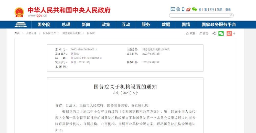 根據黨的二十屆二中全會審議通過的《黨和國家機構改革方案》、第十四屆全國人民代表大會第一次會議審議批准的國務院機構改革方案和國務院第一次常務會議審議通過的國務院直屬特設機構、直屬機構、辦事機構、直屬事業單位設置方案,現將國務院機構設置通知如下: