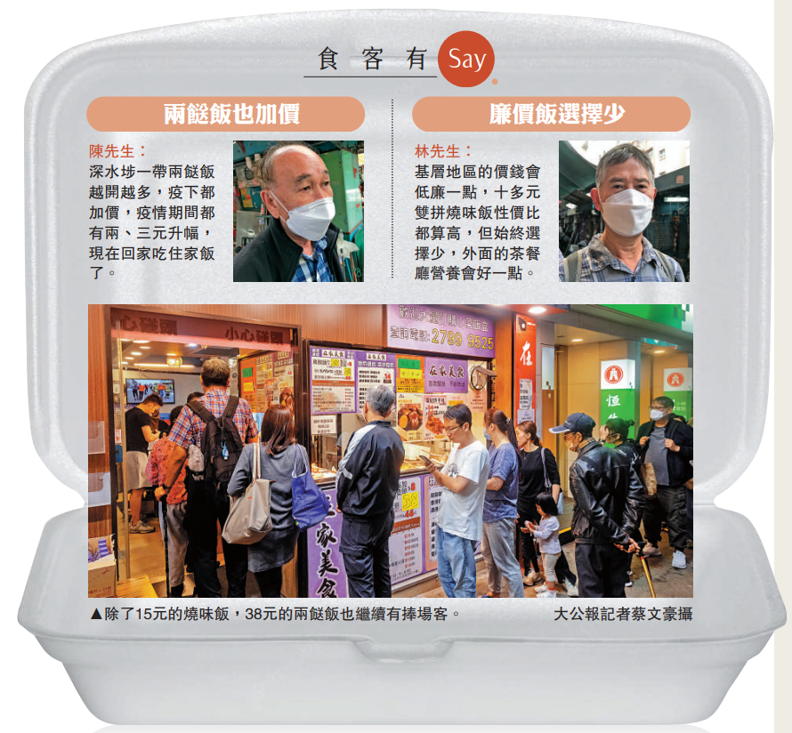 (大公報記者 鍾佩欣)社會逐漸復常,各行業隨之復甦,有分析認為,經濟好轉下,市民對兩餸飯外賣的需求將會下降;但現實中,小市民仍排隊買兩餸飯,基層人士更要「勒緊褲帶」生活。在貧窮問題較嚴峻的深水埗,兩餸飯愈開愈多,近期更出現只需15元的雙拼燒味飯,頓成「基層恩物」。