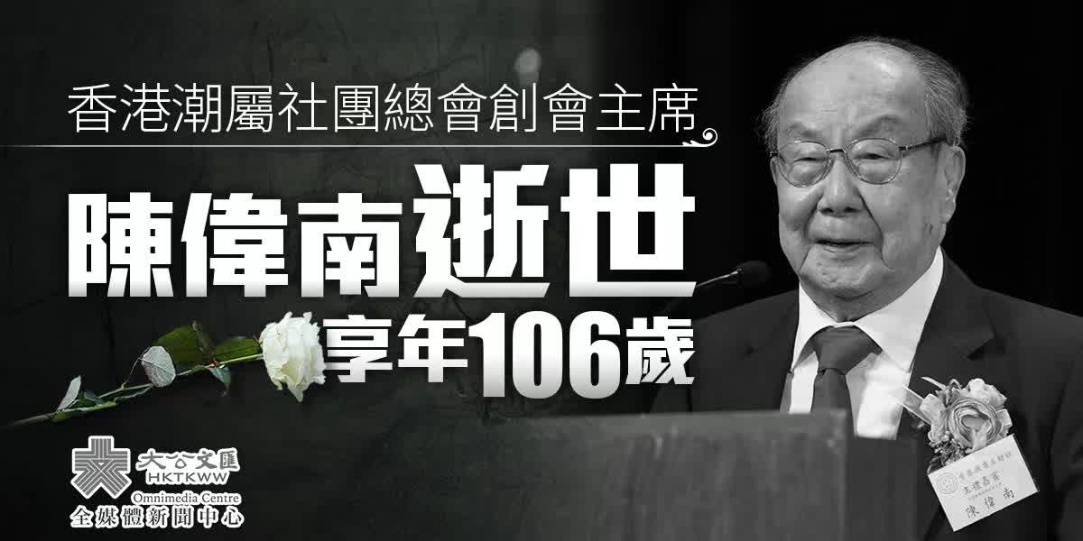 香港潮屬社團總會昨晚(20日)發布訃告,該會創會主席陳偉南20日傍晚在香港港怡醫院逝世,享年106歲。