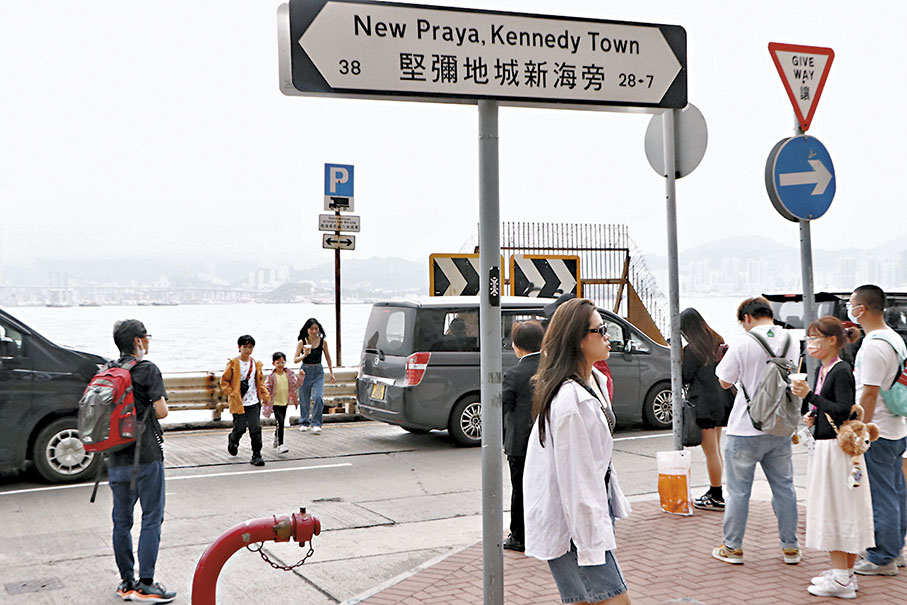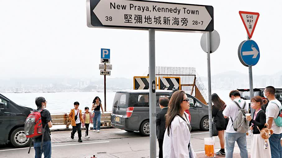 堅尼地城新海旁一帶景觀極佳,是網紅「打卡位」,香港文匯報記者昨日到現場觀察,發現海旁空間十分狹窄,海邊與馬路交接,約30多人就在馬路上「打卡」,其間汽車來來往往,遊人「走鬼式」避開車龍。