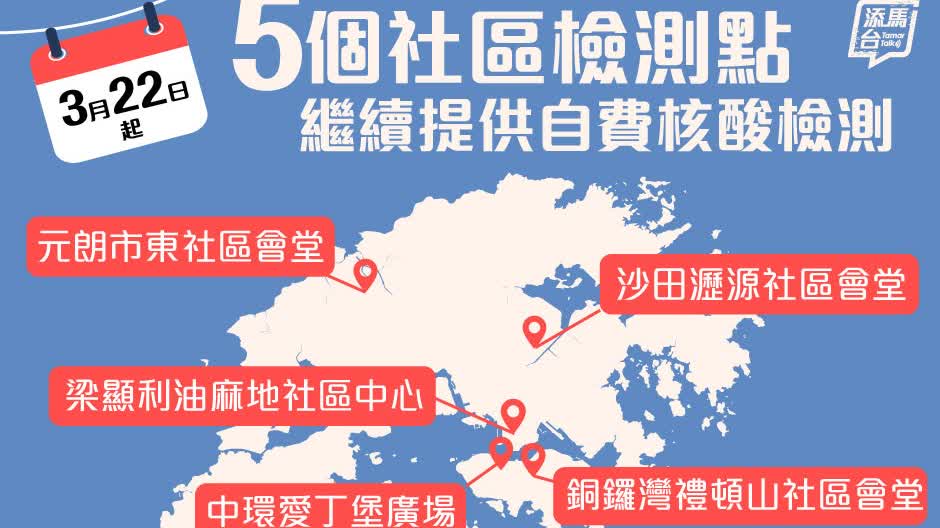 5個使用量較高的社區檢測中心及檢測站在中環愛丁堡廣場、位於銅鑼灣的禮頓山社區會堂、梁顯利油麻地社區中心、位於沙田的瀝源社區會堂、元朗市東社區會堂,會繼續為需要取得檢測結果的市民(如作為工作或出行外遊所需證明)提供自費核酸檢測服務,開放時間維持為每日早上10時至晚上8時,期間於下午1時30分至下午2時/2時30分關閉,以進行深層清潔及消毒。
