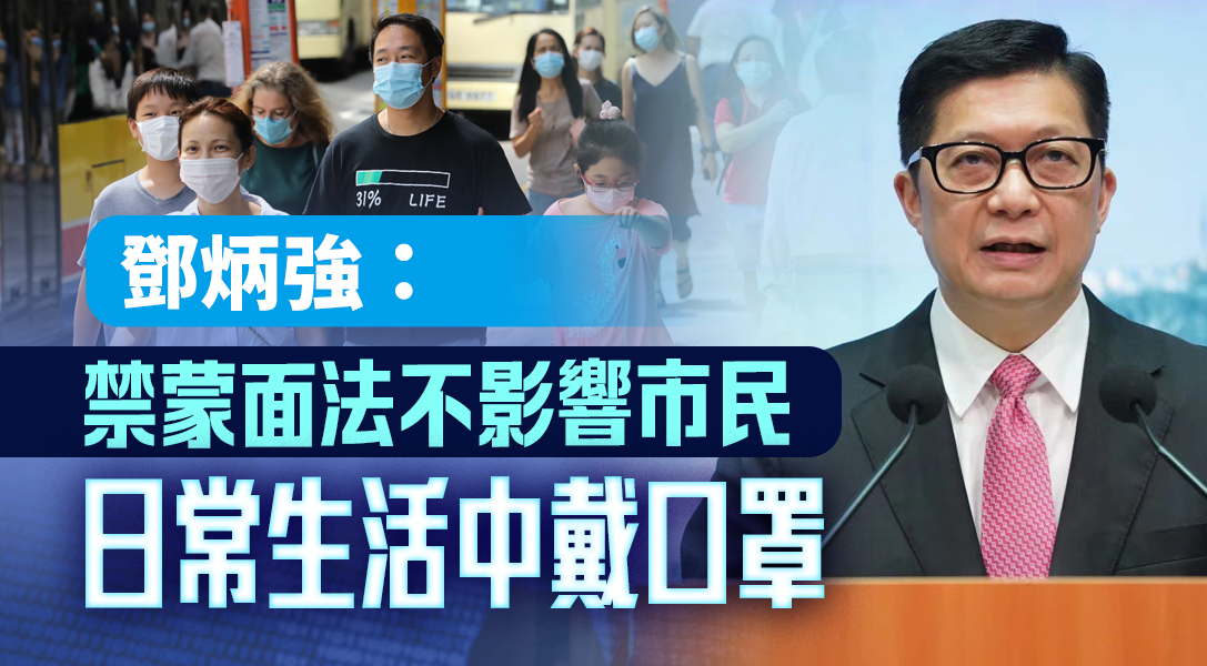 至於口罩令與禁蒙面法是否會有衝突,鄧炳強形容是「兩回事」。他指,口罩令是處理公共衞生問題,禁蒙面法是處理危害公共安全情況。穿戴蒙面物品非和平集會的核心,有關法律規管範圍只適用於《公安條例》下的公眾集會及遊行,以及違法、未經批准的集結,條例並不會影響市民日常生活中佩戴口罩。至於在公眾集會及遊行中佩戴口罩是否違例,需根據實際情況而定。