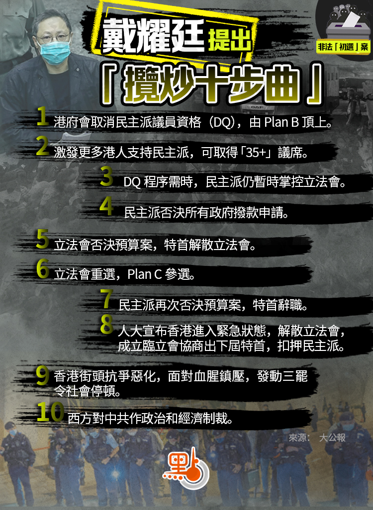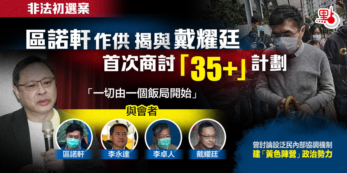 47名攬炒派人士於2020年發起所謂「35+初選」,企圖通過非法組織預備性選舉,從而在原定於當年9月的立法會選舉中,以「35+」席位奪得立法會多數控制權,並計劃無差別否決財政預算案或公共開支,迫使行政長官辭職,以達到其顛覆的政治目的。其中,戴耀廷、區諾軒等被告是「35+初選」的組織者。