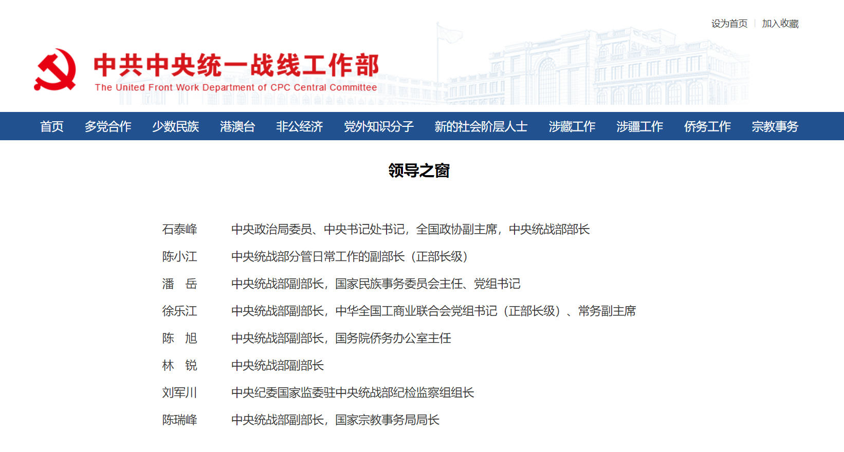 目前中央統戰部部長為石泰峰,他同時擔任中央政治局委員、中央書記處書記,全國政協副主席。陳小江為中央統戰部分管日常工作的副部長(正部長級);潘岳為中央統戰部副部長,國家民委主任、黨組書記;徐樂江為中央統戰部副部長,全國工商聯黨組書記(正部長級)、常務副主席;陳旭為中央統戰部副部長,國務院僑務辦公室主任;林銳為中央統戰部副部長;劉軍川為中央紀委國家監委駐中央統戰部紀檢監察組組長;陳瑞峰為中央統戰部副部長,國家宗教事務局局長。