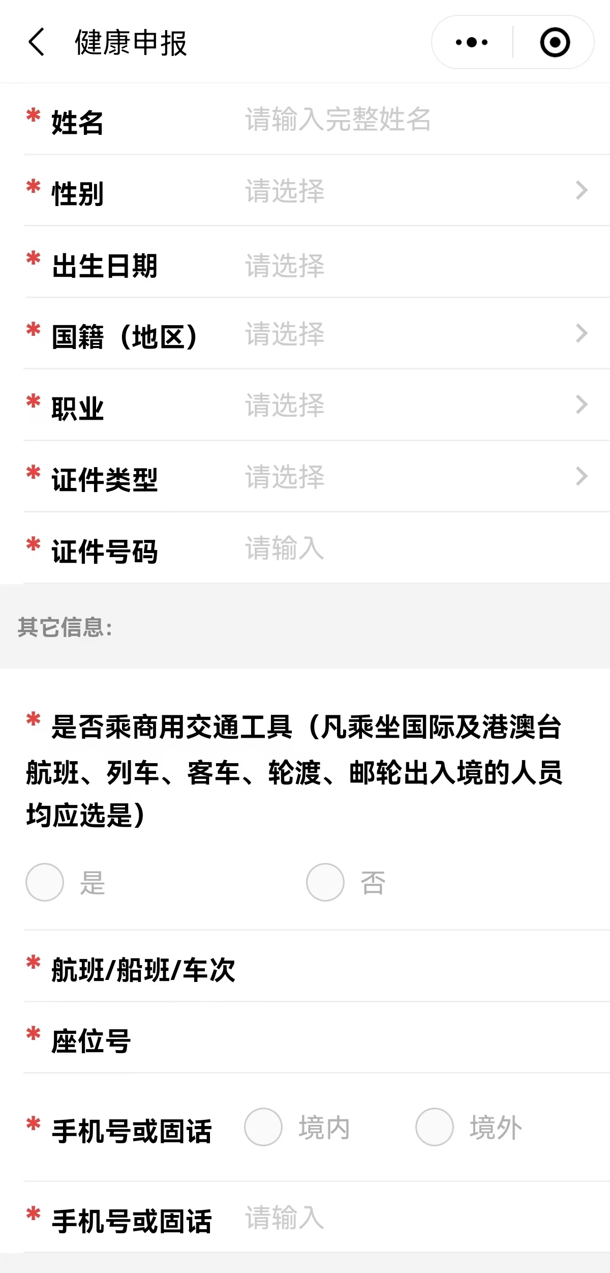記者注意到,進入微信「海關旅客指尖服務小程序」後,選擇「出入境健康申報」,在第一項「是否往來香港或澳門人員」一欄選擇「是」後,第二項「出入境類型」就自動消失,無需填寫,同時「旅居史」一欄也不用填寫。但是,若非往來港澳人員,則仍需選擇「出境」或「入境」,並且需要填寫過去14日旅居情況。