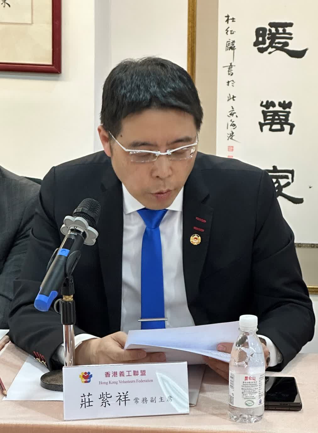 香港義工聯盟主席譚錦球於會上主持及發言表示,今年兩會是在全面貫徹落實二十大精神開局之年召開的重要會議,十四屆全國人大一次會議選舉產生新一屆國家機構領導成員,習近平主席全票當選為國家主席、中央軍委主席,充分體現了黨的意志、人民意志、國家意志的高度統一,充分反映了全國人民的共同心願。他補充堅定確保「一國兩制」實踐行穩致遠,發揮香港所長,是香港長期繁榮穩定的最佳制度保障;在保國安,促發展,贏民心,持續推進「一國兩制」行穩致遠提出了四點建議:一、進一步健全香港維護國家安全的法律制度和執行機制,強力打擊「港獨」和亂港勢力,堅定維護社會大局穩定,同時加強對青少年的教育引導,增強他們的國安意識和愛國精神。二、着力解決香港深層次矛盾和問題,採取有力措施,致力於發展經濟、改善民生,抓住住房、就業等香港市民最關切的民生問題,提出時間表和路線圖,動員一切社會力量並組織實施,讓市民看到未來,看到希望。三、爭取國家支持,加快融入國家發展大局。支持特區政府主動與內地特別是廣東對接,推動各界投入參與大灣區建設,發揮好香港作為國家人才、文化、資源等方面橋樑紐帶作用。四、積極團結各界力量,促進香港人心回歸。始終把團結香港絕大多數人、推進爭取人心回歸放在重要位置,形成由國家部門、特區政府和有關政團社團、社會各界上下合力、人人盡力的工作氛圍,深入基層,扎實貼地做好香港人心回歸工作。
