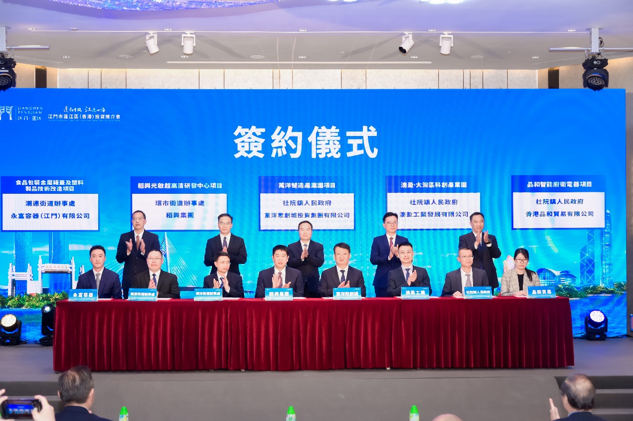 (大公文匯網記者 胡若璋)陽春三月,萬物勃發,高質量發展的春風勁吹暖大灣區。年初一路狂飆的江門蓬江區步履不停。日前,蓬江緊抓工業投資攻堅,深入落實製造業當家「一把手」工程,大力前往香港、澳門開展鏈主招商、以商引商、精準招商,大幹快上招項目、談項目,為高質量發展注入了蓬勃生機。記者獲悉,蓬江區本次在香港已經拿下籤約項目17個,投資總金額超140億元。其中,其中,涵蓋了健康食品、智能家電、智能裝備、新一代電子信息技術在內的多個主導產業發展方向,總吸引投資類項目11個,科技類項目6個。