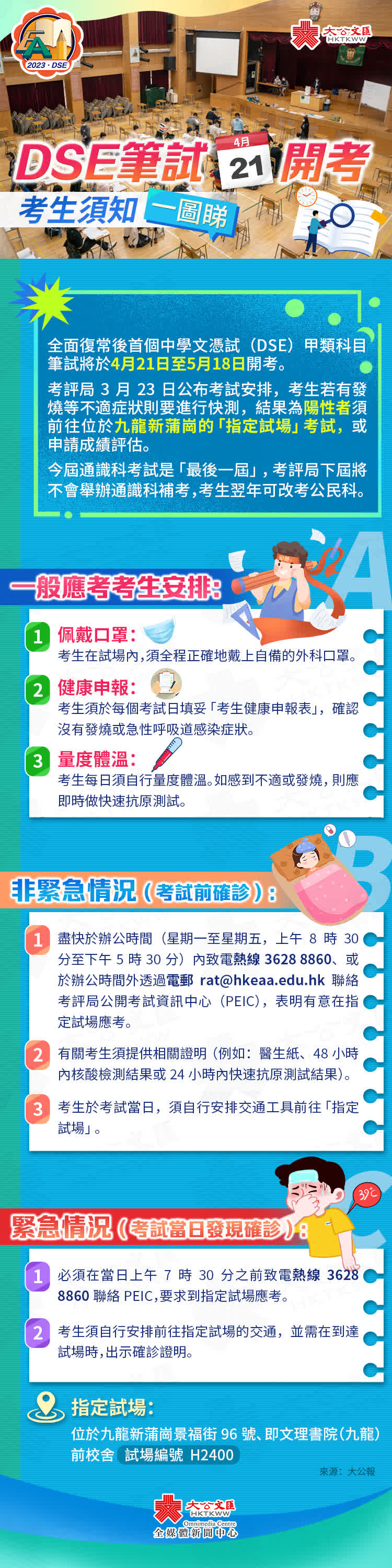 2 考生須自行安排前往指定試場的交通,並需在到達試場時,出示確診證明。