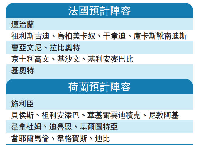 預計荷蘭隊陣容,後衛雲迪積克、傷癒獲重召的中場韋拿杜姆、前鋒迪比和高中鋒韋格賀斯仍會是球隊的中軸,只是部分主力球員其實狀態一般,而迪比加盟馬德里體育會後又處於正選和後備之間,球隊恐難與陣中核心大都在球會踢主力的法國隊媲美。此外,兩軍近7年5次對賽法國贏了4次,更令荷足是役未許樂觀。