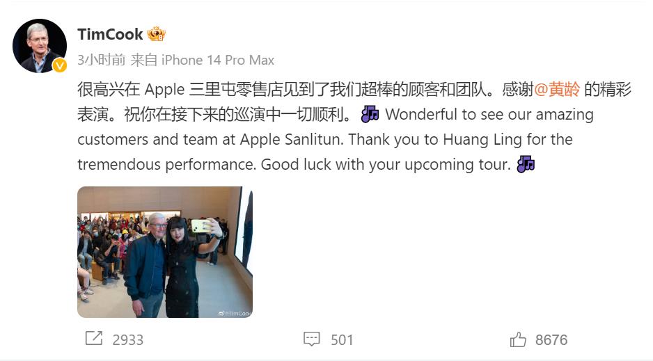 據悉,蒂姆·庫克參加了蘋果當天舉辦的「Today at Apple」活動。隨後,庫克在其個人媒體社交平台上更新了動態,他說,「很高興在Apple三里屯零售店見到了我們超棒的顧客和團隊。感謝@黃齡的精彩表演。祝你在接下來的巡演中一切順利。」