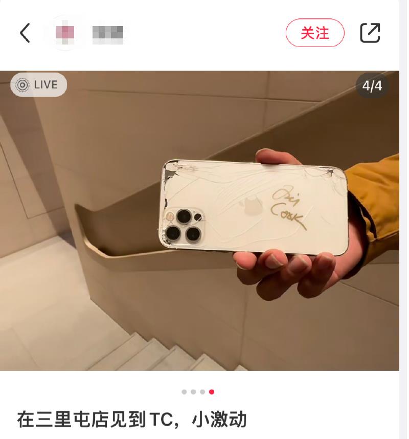 大公文匯全媒體報道,今日(24日)下午,蘋果公司CEO蒂姆·庫克突然現身位於北京三里屯的蘋果零售店內,引發了在場顧客的陣陣歡呼。有網友在社交平台發文表示,去三里屯修手機,剛好遇到Tim Cook,直接讓他在碎了的手機後蓋上籤了個名。網友紛紛回應,「這台iPhone還修不修?」「這下捨不得修直接新買一台用了,銷量+1」。