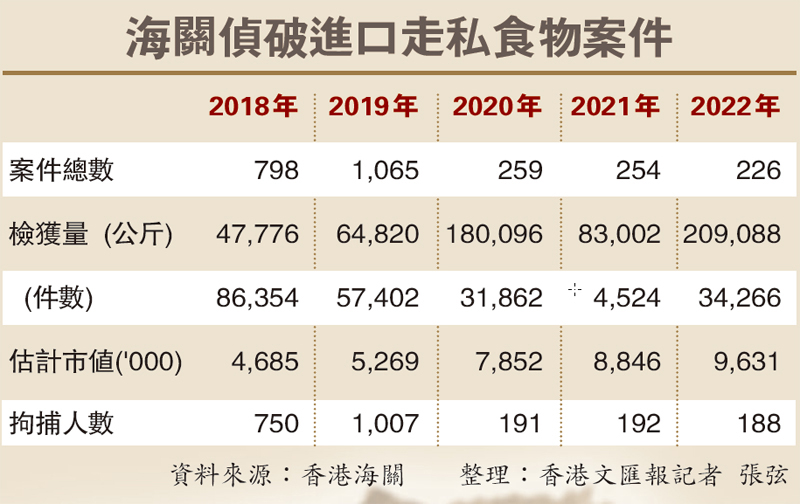 香港特區政府食環署食物安全中心接受香港文匯報查詢時表示,過去5年共檢控109輛經香港海關截查、違反《進口野味、肉類、家禽及蛋類規例》第132AK章規定的貨車,在沒有衞生證明書或書面准許的情況下進口肉類或家禽。食安中心與相關政府部門保持緊密的情報交流和合作,並採取聯合行動,以打擊非法進口食物活動。根據《公眾衞生及市政條例》,任何在香港出售擬供人食用的食物,不論進口或本地生產,必須適宜供人食用,違例者最高罰款50,000元及監禁6個月。