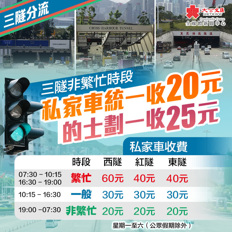 大公文匯全媒體報道,本港三條過海隧道收費方案「兩步走」,首階段私家車實施收費「633」制,西隧減至60元、紅隧及東隧統一增至30元;在年底前的第二階段,私家車繁忙時段使用西隧維持60元,紅隧及東隧則再增至40元,非繁忙時段,三隧劃一為20元。運輸及物流局局長林世雄今日(25日)在一電台節目指,因應社會疫後復常,新收費方案需要有過渡階段,在市民適應後,才推出不同時段不同收費。