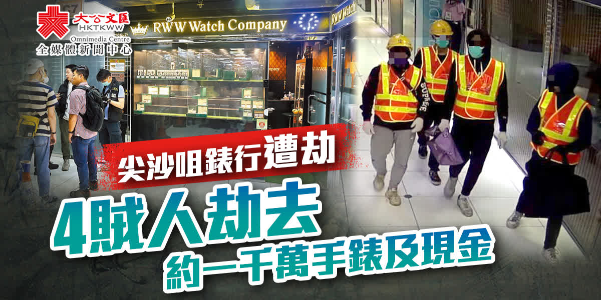 (香港文匯報 記者 蕭景源)尖沙咀昨日發生今年最大宗械劫案,彌敦道36號「重慶站購物商場」2樓一間錶行,被4名穿反光背心打扮成地盤工的南亞裔匪行劫。匪徒持刀指嚇職員,約5分鐘掠走飾櫃總值約1,000萬元的50隻名錶,得手後施施然下樓,登上接應的私家車逃離。警方到場圍捕,得知賊人搶走一名職員的手機及3萬元現金,而手機GPS顯示賊人曾在港鐵九龍站近漾日居出現,相信沿西九龍快速公路向荃灣方向逃去。警方現正憑「天眼」追緝劫匪。