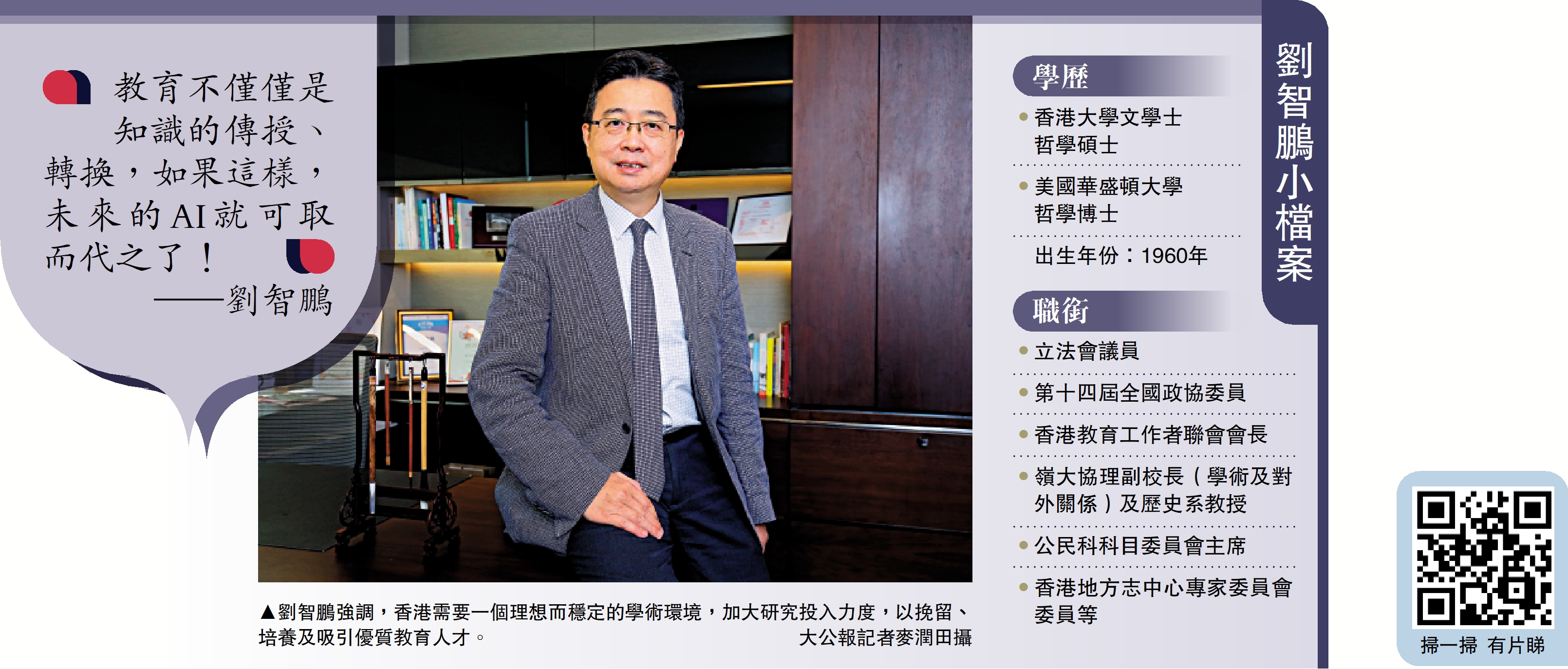 身兼教聯會會長、立法會議員、嶺南大學協理副校長、全國政協委員等多個職務的劉智鵬,如何平衡好工作時間?他笑道:「沒什麼,這樣的工作強度,我已經習慣廿年了。」