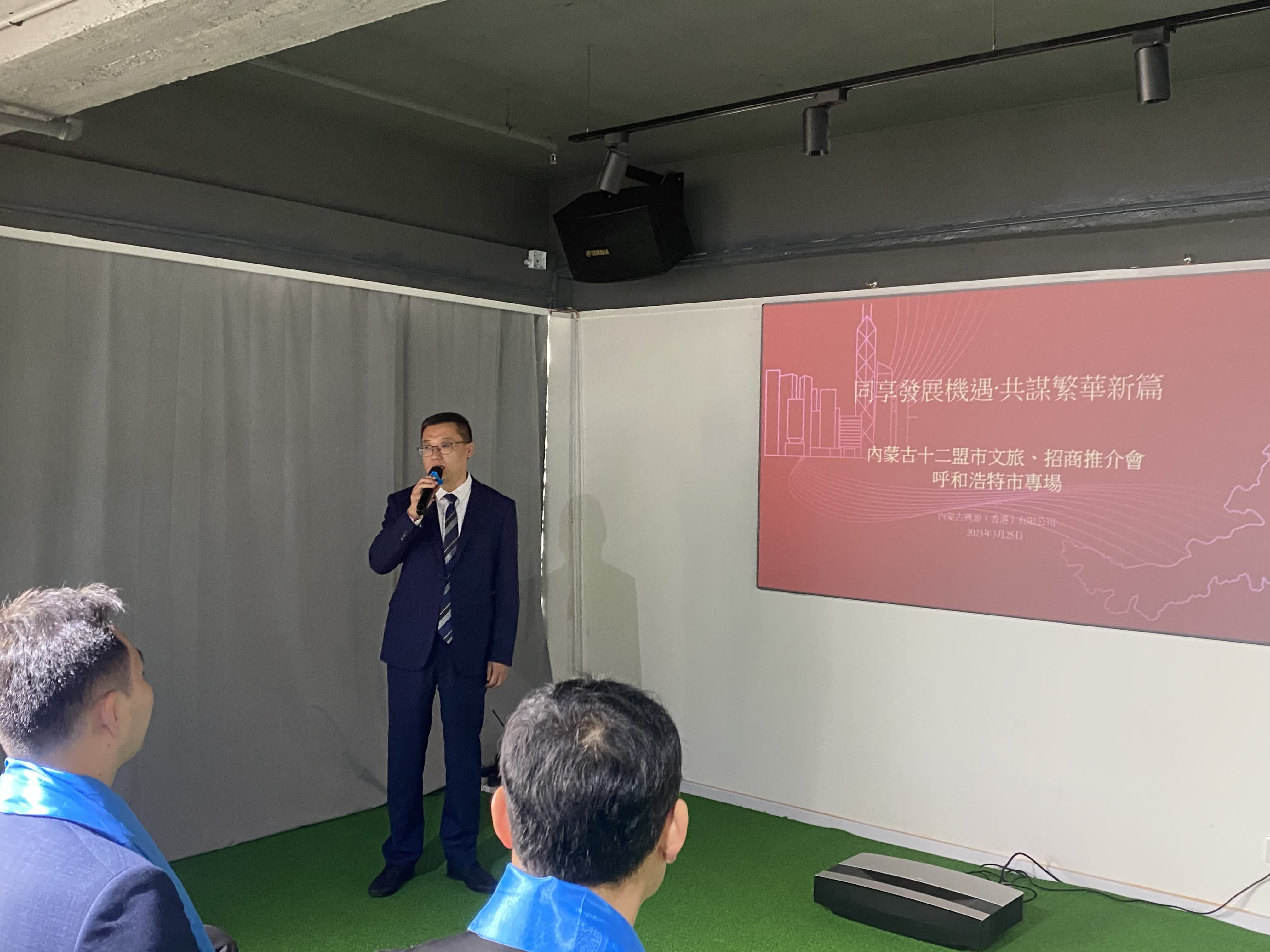 活動開始前,在場嘉賓觀看了內蒙古自治區與呼和浩特市的文化旅遊、招商引資宣傳片。李文杰受內蒙古興源(香港)有限公司總經理阿木古楞委託代表內蒙古香港文化旅遊中心致歡迎辭。他表示,興源公司承擔著宣傳推廣內蒙古的任務,這次活動是由自治區文旅廳、貿促會委託公司在港宣傳推廣的一項重要內容,旨在通過活動讓大家瞭解內蒙古、感受內蒙古、投資內蒙古。他談到,興源公司計劃將該活動逐步擴展涵蓋內蒙古自治區十二個盟市,每月舉辦一場專場推介,也希望在座的各位能夠繼續參與,同時邀請更多的業界同仁來公司感受內容豐富、與眾不同的內蒙古。