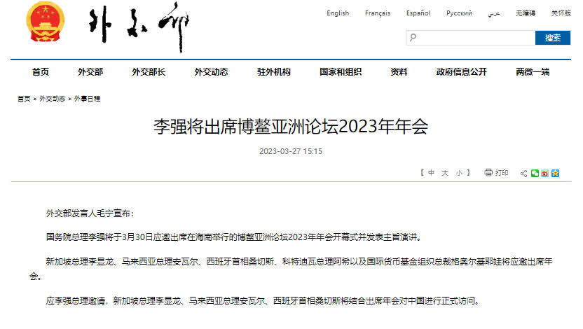 據外交部網站消息,外交部發言人毛寧今日(3月27日)宣布,國務院總理李強將於3月30日應邀出席在海南舉行的博鰲亞洲論壇2023年年會開幕式並發表主旨演講。