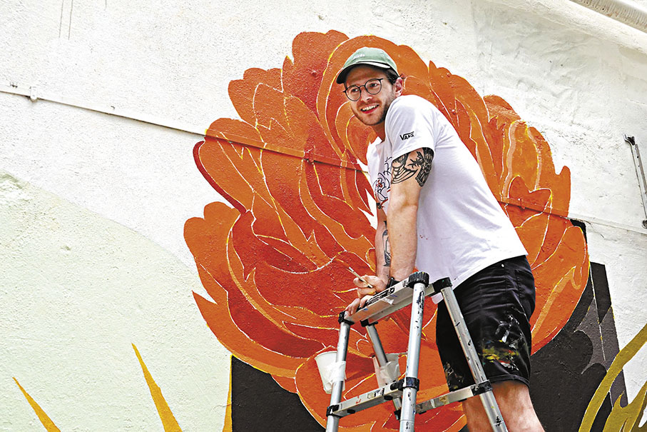 如若觀眾從上環出發,便可以來一場街頭藝術尋覓之旅。今次參與HKwalls的藝術家不少來自國外,蜚聲國際,他們以各具特色的畫風首次於香港留下印記,映照這文化交流的中心。在上環新街,藝術家Mára Cmára在這裏繪下一朵牡丹。HKwalls執行總監黃智茵(Maria)介紹,Mára是來自捷克布拉格的插畫師:「今次他選用代表中國的牡丹,和迎合兔年的兔子形象,來構成他在亞洲區的第一幅作品中的主要元素。」