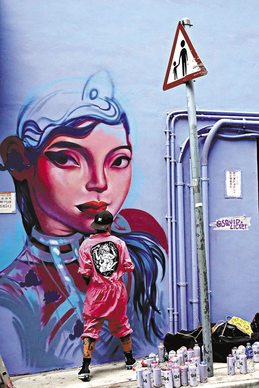 沿着太平山街走上四方街,映入眼簾的是來自美國藝術家Lauren YS的塗鴉作品,她的畫風充滿個性,有超現實風格。Lauren本身有一半中國血統,因此她的作品有很多「中國元素」,而20歲出頭便開始從事街頭塗鴉的她,作畫效率高得令主辦方也震驚,她創作時只使用噴漆,便可在兩天內完成整幅牆面精美的畫作。而今次她作品中塑造的女性,其實是源於她孿生姐姐的形象:「姐姐曾經在香港生活過一段時間,因為無法適應而離開,將她的樣子噴繪在這個城市裏,作為一種紀念。」創作前Lauren曾在周邊街區做資料蒐集,比如太平山街的觀音廟,就被她融入作品中人物的頭部,意為「心靈的廟宇」,藝術家希望大家可以關注自己的心靈健康,多點時間照顧自己的靈魂。