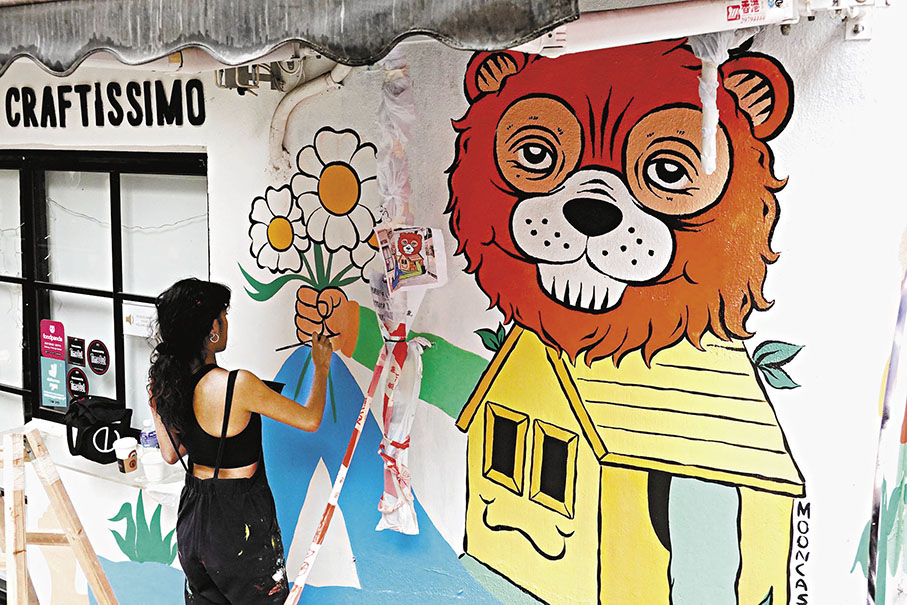 香港藝術家Mooncasket(Evie)在太平山街的一間酒吧外完成了自己的壁畫作品。她擅長創作怪誕、復古風格的卡通畫作,今次畫的小熊色彩鮮艷,Evie介紹:「這隻熊就好似現在可以走到戶外,擁抱外面世界的我們。因為這個位置是夜晚大家會坐着喝酒的位置,我希望以這幅壁畫帶來開心的氛圍,所以顏色都是比起我之前的作品會更明亮跳躍。」