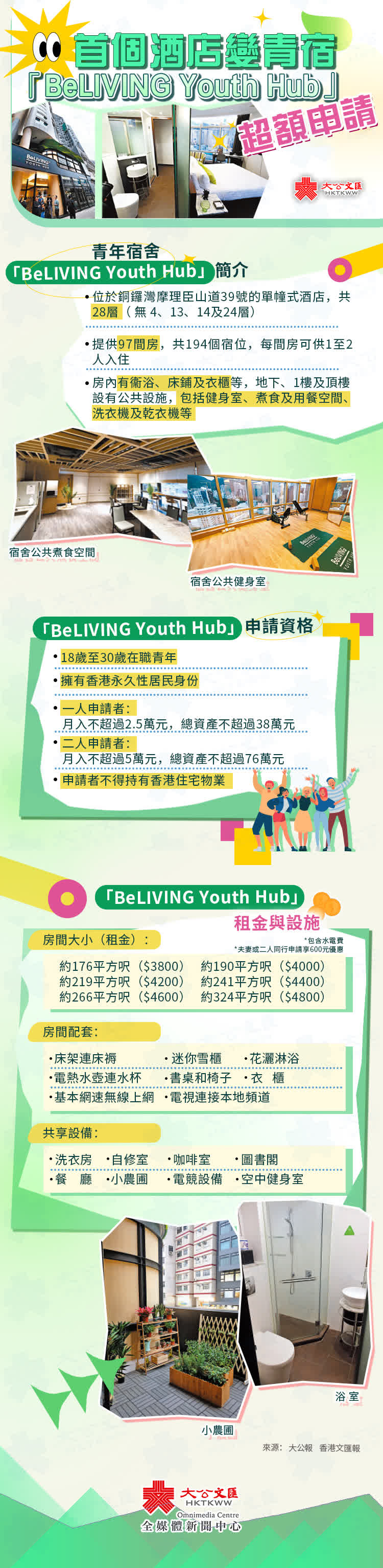 「BeLIVING Youth Hub」宿舍位於銅鑼灣摩理臣山道,臨近銅鑼灣港鐵站,本月中起接受申請,首階段申請於下月28日截止。合資格人士為18歲至30歲的香港在職青年,同時須符合多項要求,包括滿足一定入息及資產限額,不得擁有住宅物業;如果本身是公屋住戶,不能因入住青年宿舍而令公屋或中轉屋空置等(見表)。首次簽約租期為2年,可酌情續約,最長可租住5年。