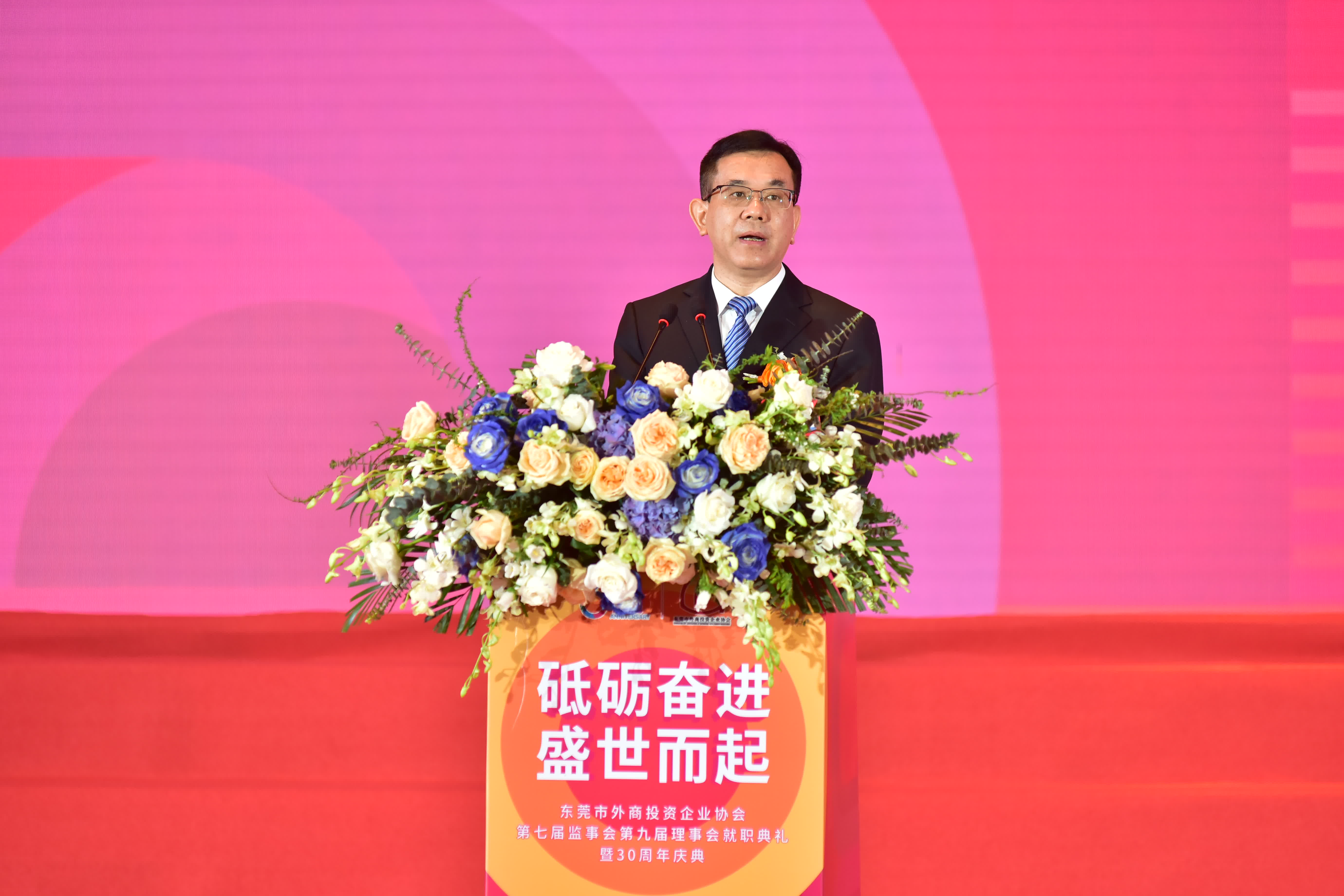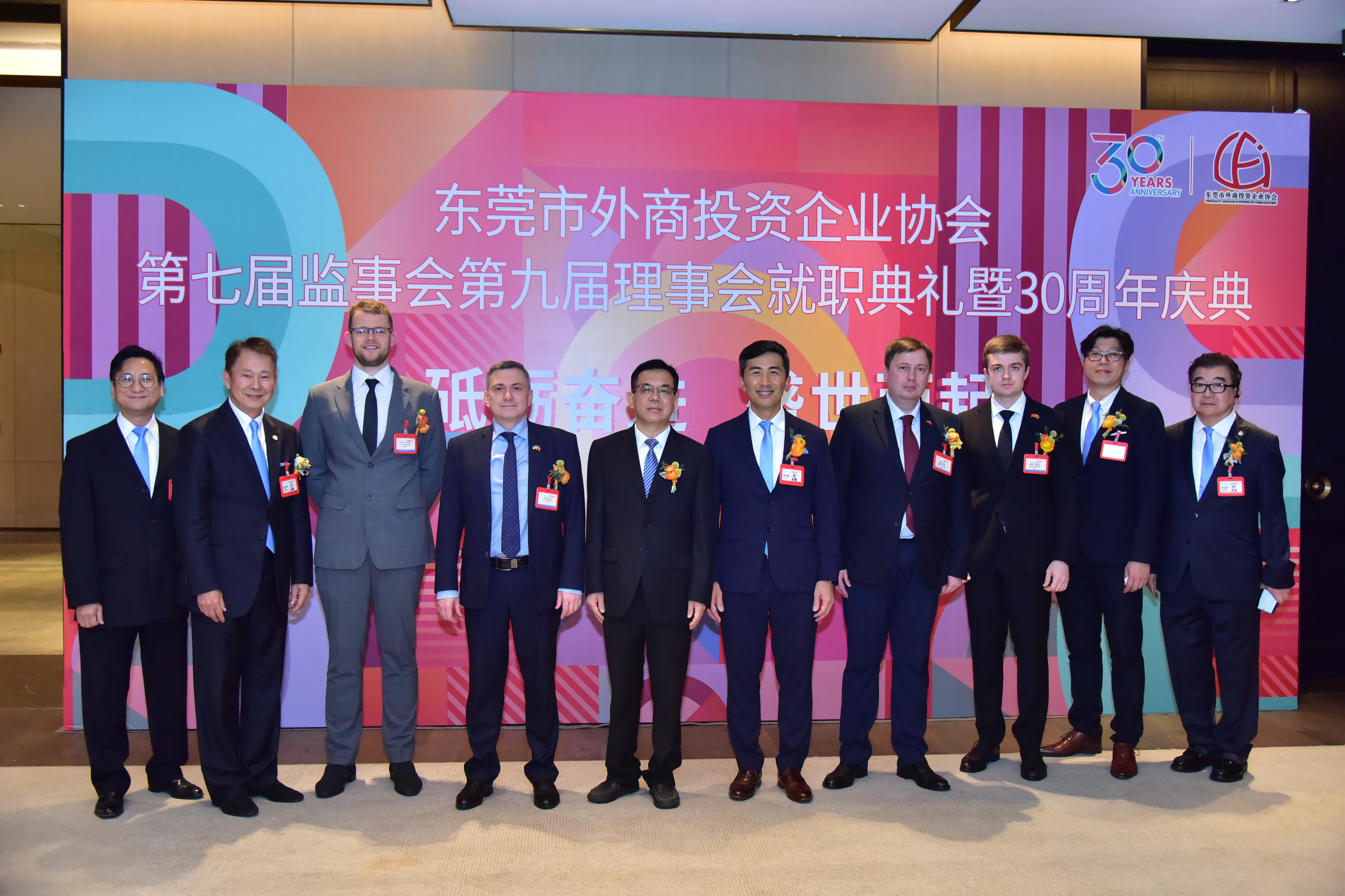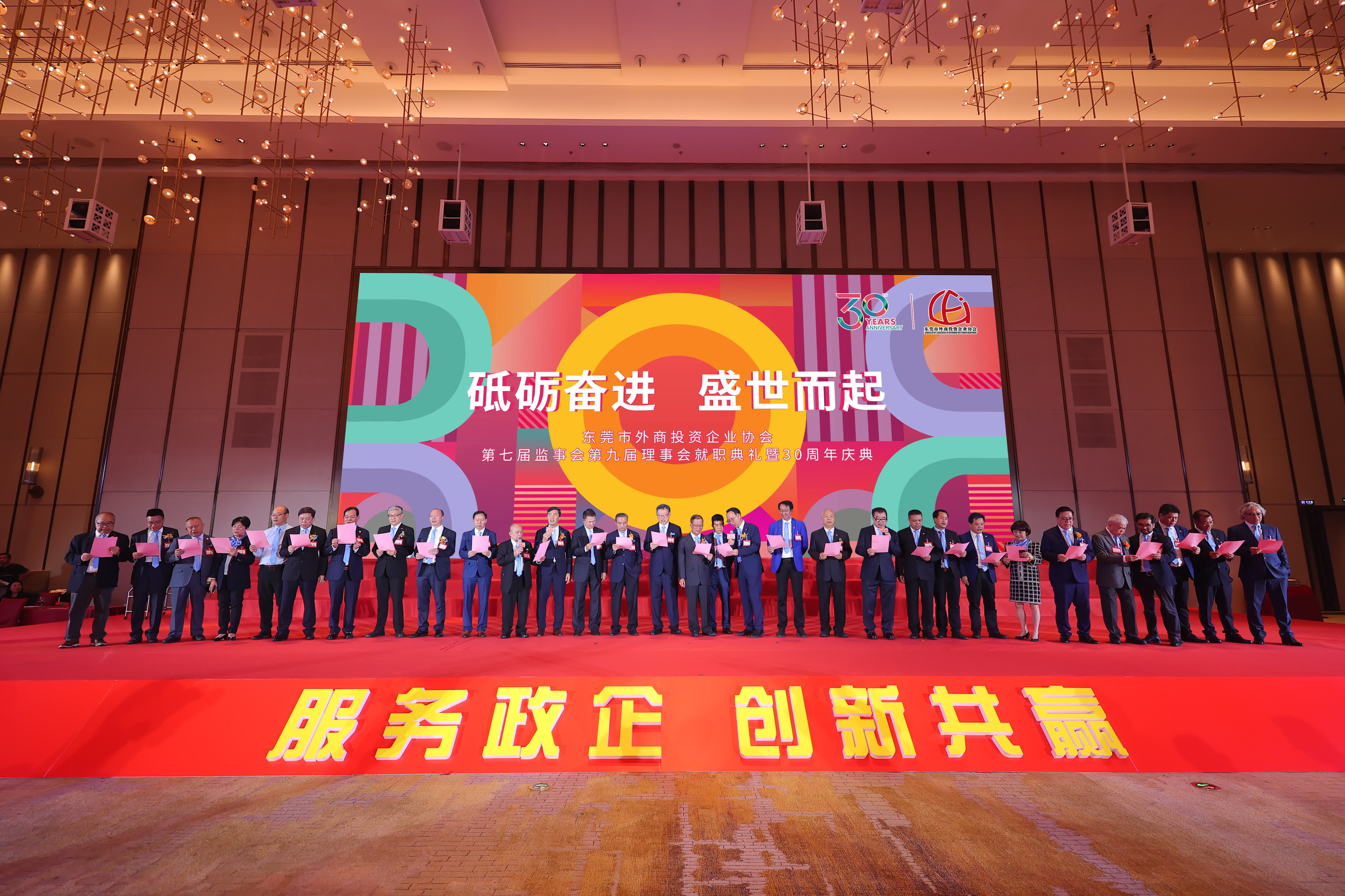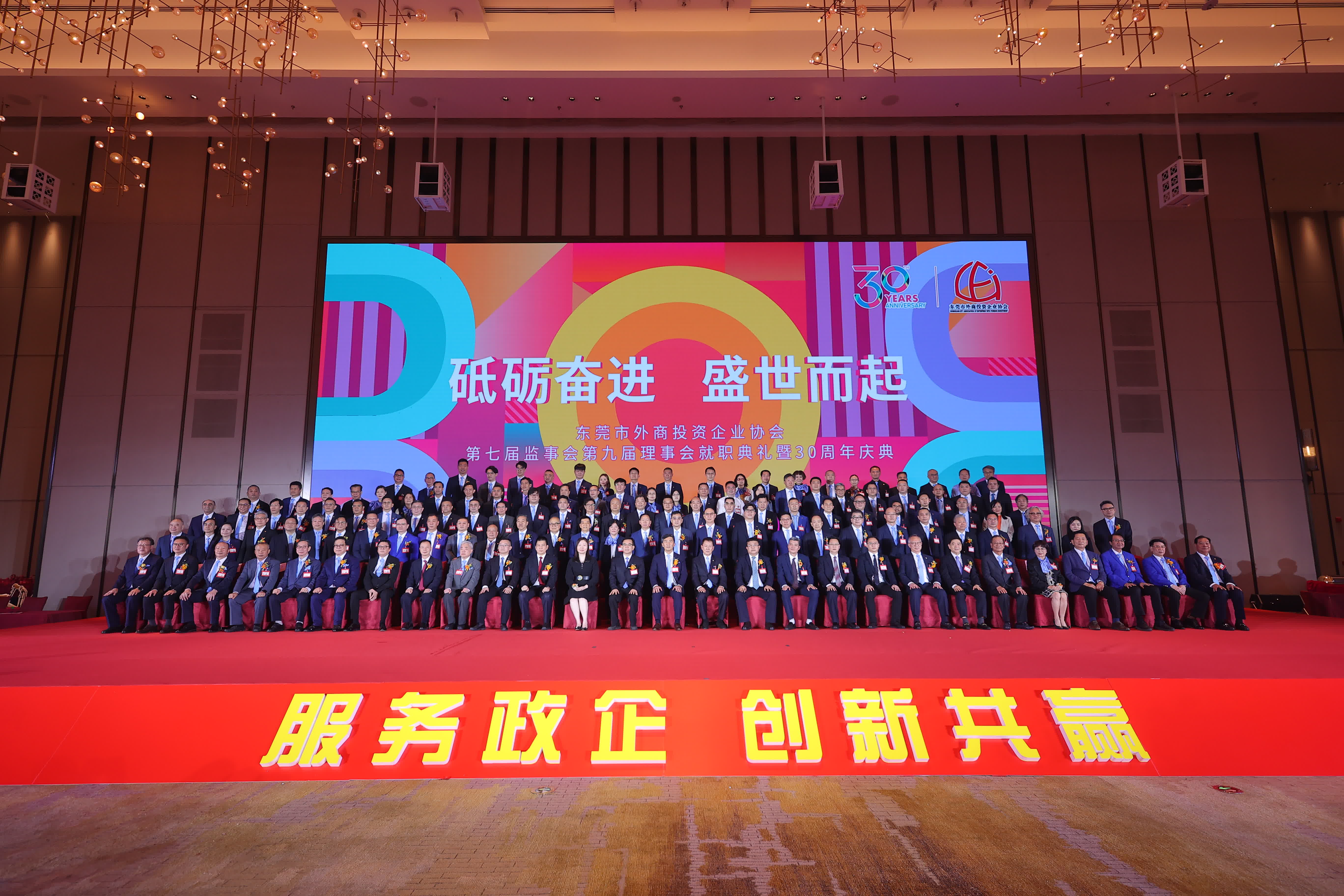 日前東莞市外商投資企業協會(以下簡稱 東莞外商協會)第七屆監事會、第九屆理事會就職典禮暨30周年慶典圓滿舉行。為更好地發揮東莞外商協會橋樑紐帶作用,進一步增強協會凝聚力,東莞市人大常委會黨組書記、主任駱招群,香港中聯辦廣東聯絡部主任范克勝,香港駐粵辦主任蘇惠思,廣東省委統戰部二級巡視員黄石松,東莞市委常委、統戰部部長陳志偉,東莞市政協黨組成員万卓培,東莞理工學院黨委副書記李忠紅,全國政協常委、香港東莞社團總會主席譚錦球,香港貿易發展局廣州代表處華南首席代表黃天偉等省、市、友好單位有關領導,以及廣東黃埔報關協會,美國、加拿大、泰國、西班牙、古巴、烏克蘭、白俄羅斯等國家駐廣州總領事館和商會,東莞外商協會及35個分會監理事、會員代表等社會各界嘉賓近800人出席了此次盛典。