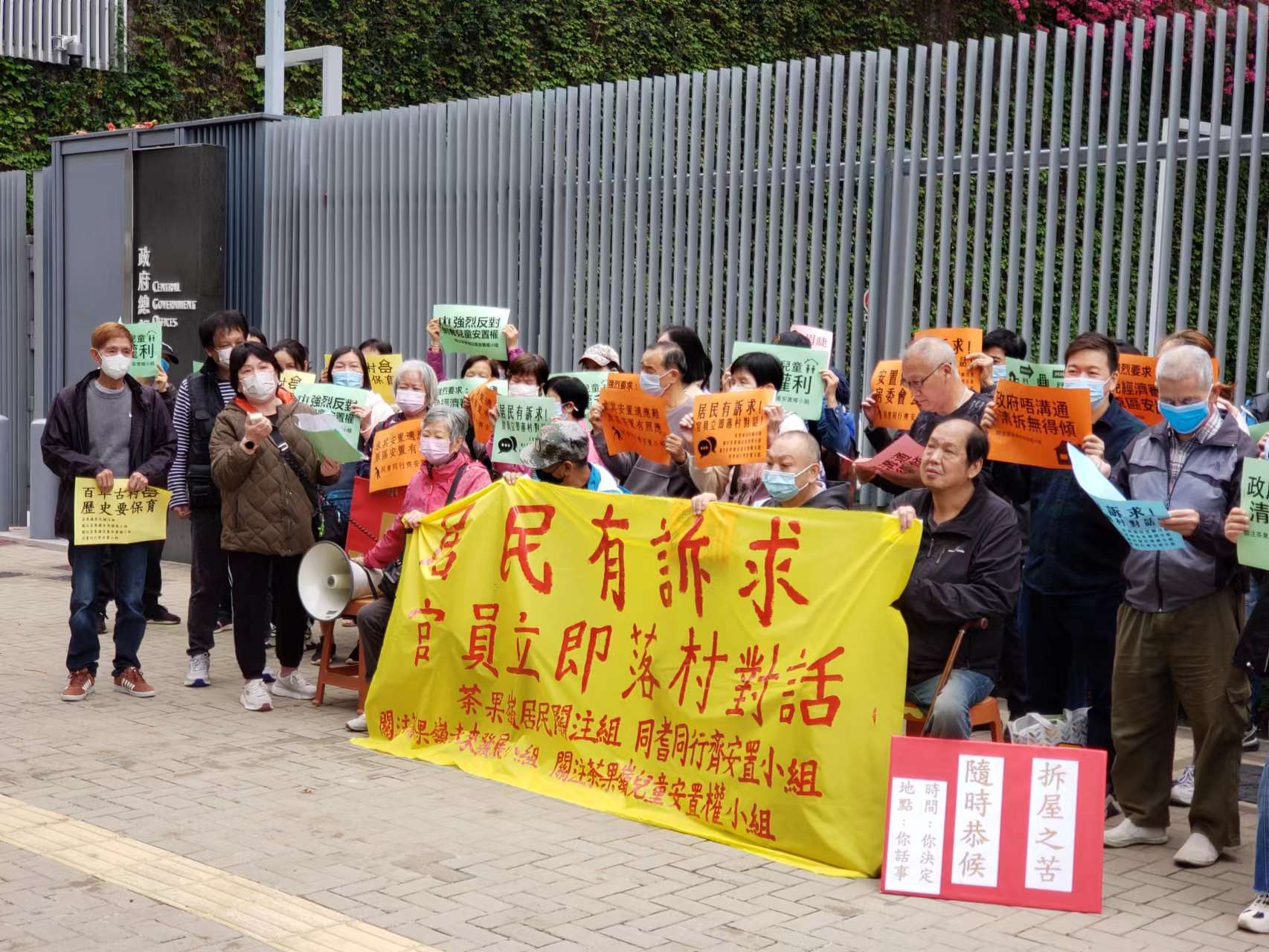 請願團體指,過往多次邀請相關部門與茶果嶺村民會面,但至今未獲答應。今日再次向發展局和地政總署發出請帖,邀請政府部門盡快到村內與村民會面和回應各種問題,減低清拆對茶果嶺村民的影響。