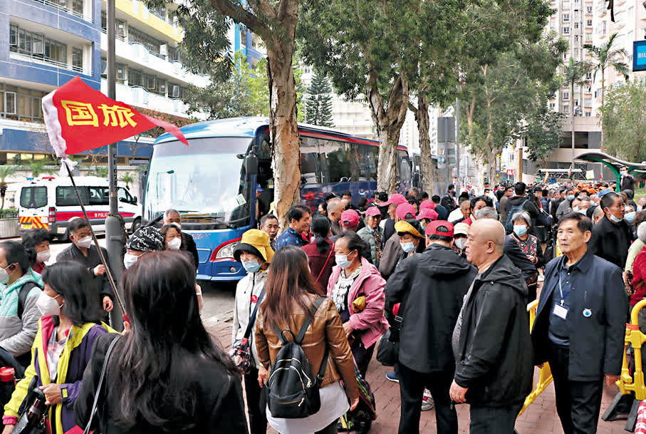 (香港文匯報 記者 張弦、費小燁、文森)香港與內地全面復常通關後,大批內地旅行團重臨,香港的接待能力再受考驗,包括對旅行團的膳食安排等。香港文匯報記者昨日到土瓜灣一間提供旅行團「團餐」的酒樓,發現午膳時間幾乎每5分鐘就有四五架旅遊巴載着大批旅客到埗,酒樓門前的行人路聚集逾千名旅客,有些旅客反映團餐天天都是鹹菜、饅頭等食品;一些貴價團餐雖然有魚有肉,但每人限時15分鐘用膳。有飲食業界向香港文匯報表示,各區提供團餐的食肆已倒閉,早前才有兩間酒樓看中土瓜灣租金平而重新開業,每名團友伙食成本控制約40元,必須日接逾千客才能收支平衡,卻對附近交通造成負荷,建議特區政府在觀塘碼頭、葵涌工廈區等離遠民居的地方,開設旅行團美食城。