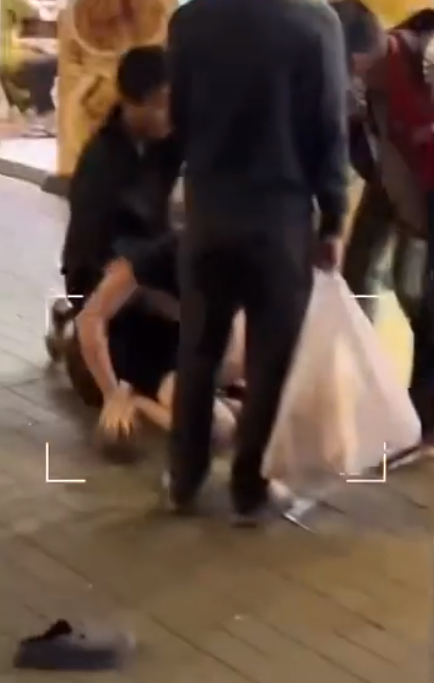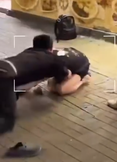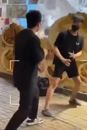 口罩男拉低口罩,疑似對眼鏡男吐口水,眼鏡男憤怒摑向口罩男面部,繼而連環揮拳。口罩男被打得腳步踉蹌,竟未有退縮,在商場旁邊一地舖外放下背囊,準備全力搏鬥。只見雙方擺好架勢,展開正面交鋒,戰鬥一觸即發。而拍攝影片的男子此時出言相助,指已經幫眼鏡男拍下對方行徑,證明是口罩男首先出手。