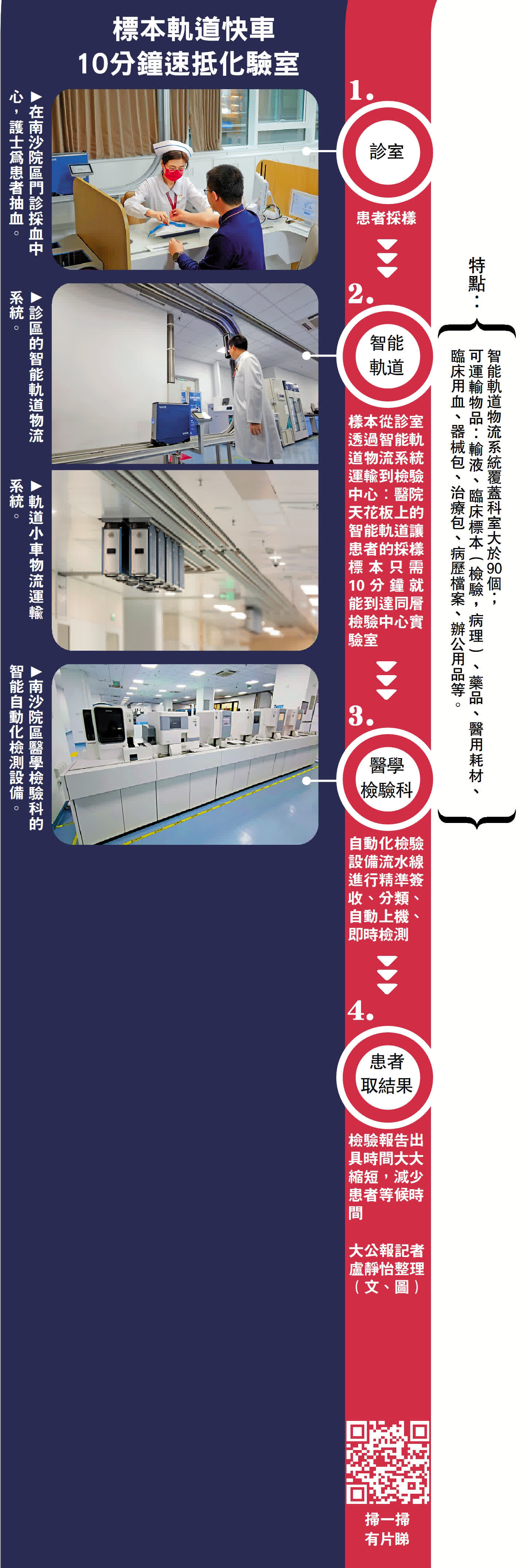 記者在醫院走訪時,頭頂上不時有手提箱大小的小車順滑駛過。中山一院南沙院區醫學檢驗科執行主任徐鴻緒告訴記者,這些小車是智能運輸車,轉載着患者採樣標本,只需10分鐘就能到達同層的檢驗中心實驗室。「以往患者採樣後,最快需要兩小時拿到檢驗結果,實際上實驗室的檢驗時間只需半小時到一小時,大量時間花費在人力運送途中。」