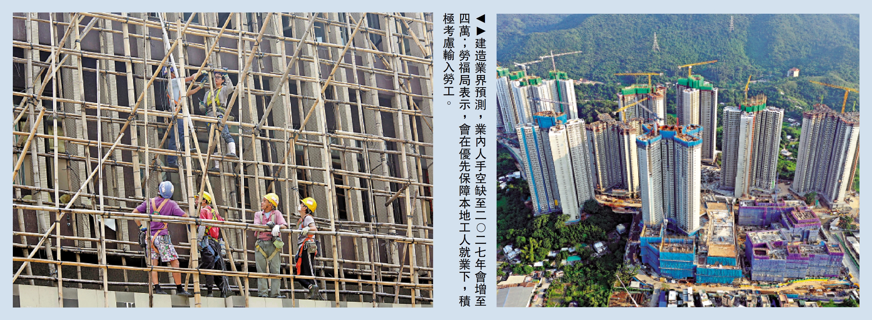 發展局昨日回應傳媒查詢表示,局方於建造業議會發表最新的《建造業人力預測報告》當日已表明,會參考有關報告,評估如何以多種策略,包括善用本地人力資源、加強培訓和因應需要引入非本地資源等各項措施加強人力供應,以及利用提升生產力的措施減低人力需求。局方重申,目標是今年中或之前完成評估,並為應對建造業人手需求提出整全策略。