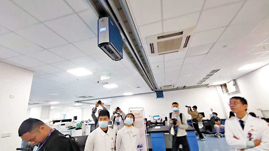 香港文匯報記者在醫院走訪時,頭頂上不時有手提箱大小的小車順滑地駛過。中山一院南沙院區醫學檢驗科執行主任徐鴻緒表示,這些小車是智能運輸車,轉載着患者採樣標本,只需10分鐘就能到達同層的檢驗中心實驗室。「以往患者採樣後,最快需要兩小時拿到檢驗結果,實際上實驗室的檢驗時間只需半小時到一小時,大量時間花費在人力運送途中。」借助安裝在診區天花板上的智能軌道物流系統,檢驗報告出具時間大大縮短,減少患者等候時間。
