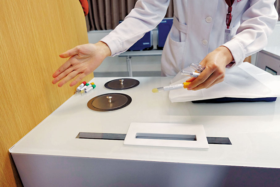 在採血中心,南沙院區門診區護長趙明為患者採血後,便把樣本試管放進桌面上的管道,只需60秒的時間,試管就可全自動運輸至檢驗科室。而患者的信息也通過機器「智慧貼標」,以3秒速度貼好標本條碼。趙明說:「放入運輸管道的標本樣本試管會自動上機,運到檢驗科流水線。全程無需人工操作,出檢驗報告時間提速50%以上。」