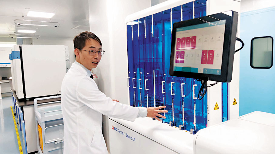 進入檢驗科,映入眼簾的是一排排智能自動化檢測設備,這是多個檢測流水線系統。南沙院區是擁有亞洲單個實驗室最大規模檢驗流水線的醫院之一。其急診生化免疫流水線可以每小時測試2,700個樣本,預計急診樣本上線後1小時內完成生化、免疫檢測。另一個全自動微生物樣本處理系統,樣本處理速度最快可達每小時220片。中山一院檢驗科副主任陳培松表示:「這是目前市面上速度最快的軌道。」